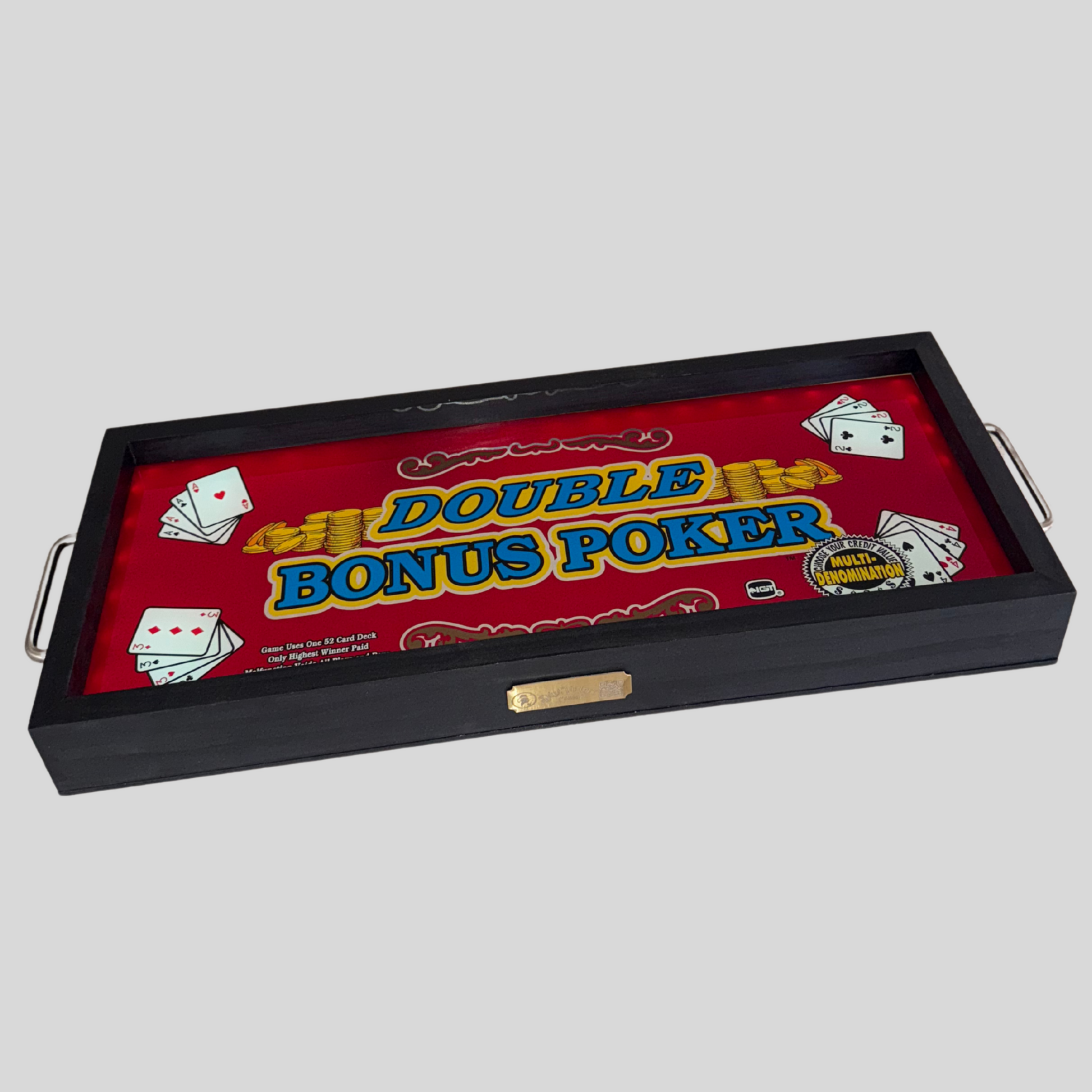 Elevate your collection with this Double Bonus Poker Vintage Slot Machine Glass, showcasing a bold and colorful design that captures the excitement of high-stakes poker. Featuring vibrant red and blue hues, eye-catching gold coin stacks, and classic playing card graphics, this piece embodies the thrill of the popular casino game. Whether you're a collector, a game room enthusiast, or simply love vintage casino decor, this slot glass is a standout addition to any space. Add a touch of winning style to your collection today!