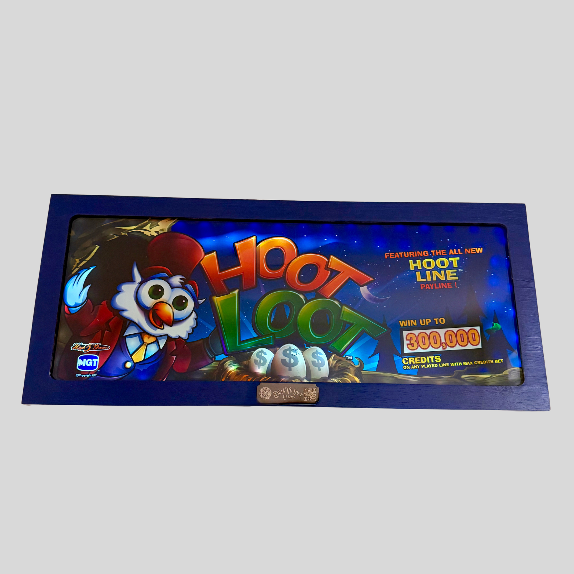 The Hoot Loot Slot Glass is a lively and whimsical piece featuring a charmingly dressed owl, complete with a top hat and suit, adding a playful touch of sophistication. Set against a nighttime forest backdrop with glowing dollar-sign eggs in a nest, the design brings an air of mystery and fortune. The bold, colorful typography enhances the fun, making this a standout piece for collectors, casino décor enthusiasts, or those who appreciate lighthearted and nostalgic gaming art. Perfect for adding a quirky yet classic charm to any space.