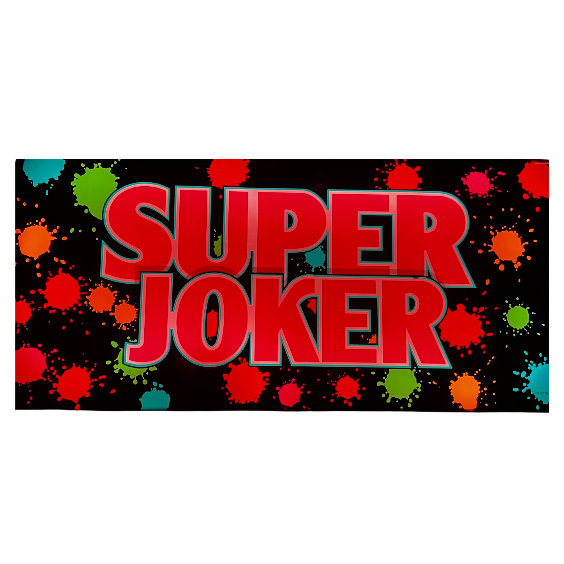Introducing the "Super Joker" slot machine glass, a dazzling and whimsical piece that captures the lively spirit of classic casino gaming. This eye-catching design features the iconic Joker in a vibrant, multi-colored jester outfit, surrounded by a flurry of playing cards, stars, and sparkling symbols. The energetic and dynamic artwork brings the playful unpredictability of the Joker to life, adding a touch of fun and excitement to any space.
