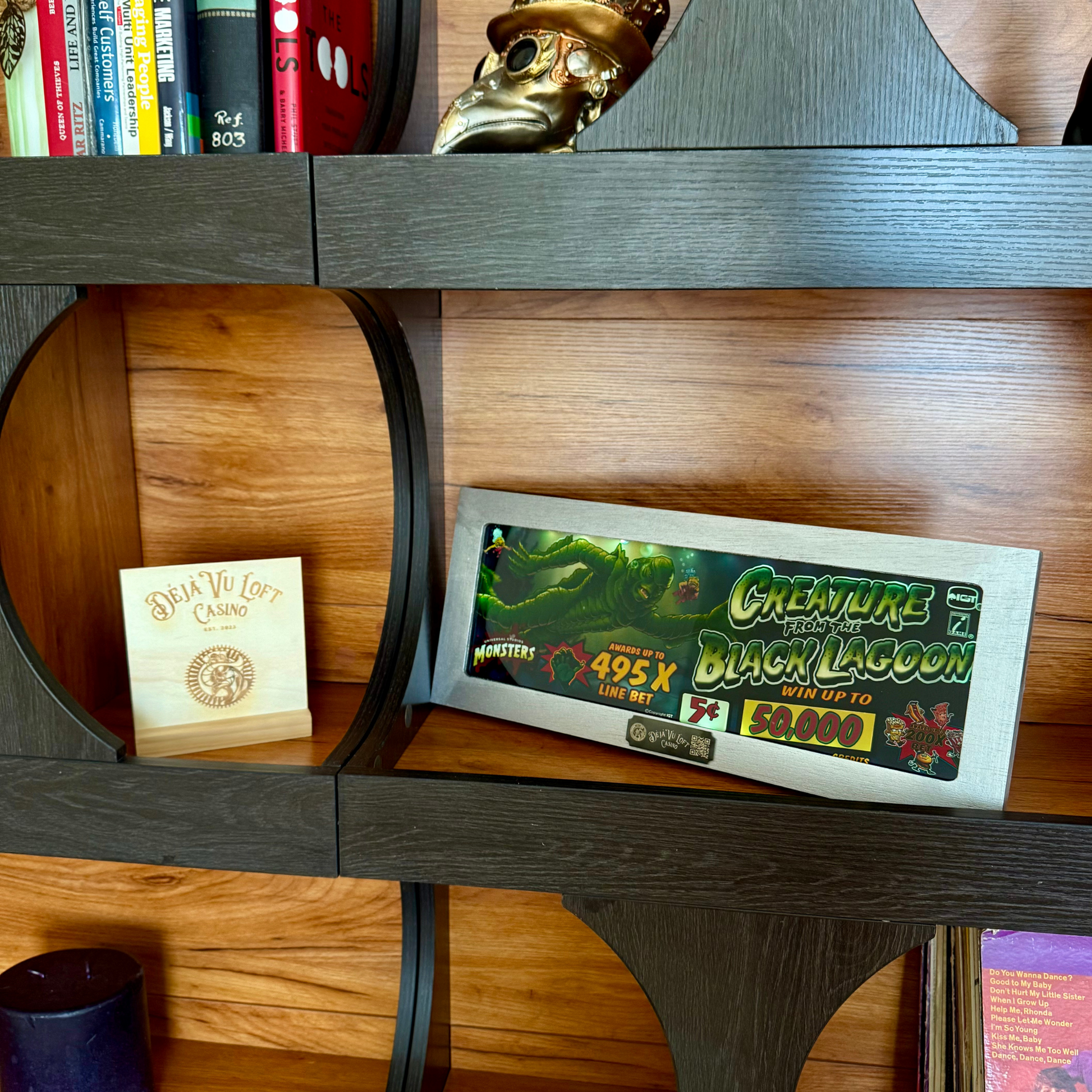 The Creature from the Black Lagoon Slot Glass plunges you into vintage monster-movie nostalgia with its bold aquatic design and retro horror vibe. Featuring the iconic green Gill-man swimming toward you through murky water, this piece pays homage to Universal’s classic creature feature. With dramatic fonts, vibrant colors, and a callout to massive wins (up to 495X your line bet!), it's perfect for horror lovers, movie buffs, and anyone who thrives on thrills. A standout for any game room, man cave, or collector’s wall.