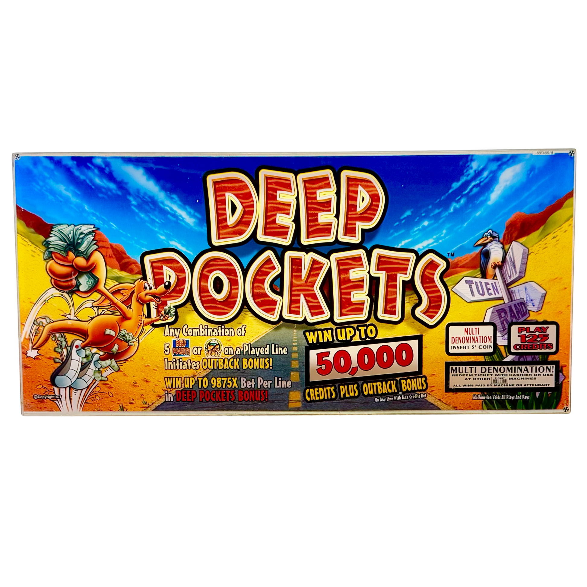 Add a touch of playful desert adventure to your collection with this Deep Pockets Vintage Slot Machine Glass, featuring a lively roadrunner character clutching a fistful of cash against a vibrant highway backdrop. The bold red and yellow lettering, coupled with whimsical details like the signpost and desert landscape, make this piece a standout addition for collectors, game rooms, or anyone who loves classic casino nostalgia. Bring home this fun and quirky slot glass today!