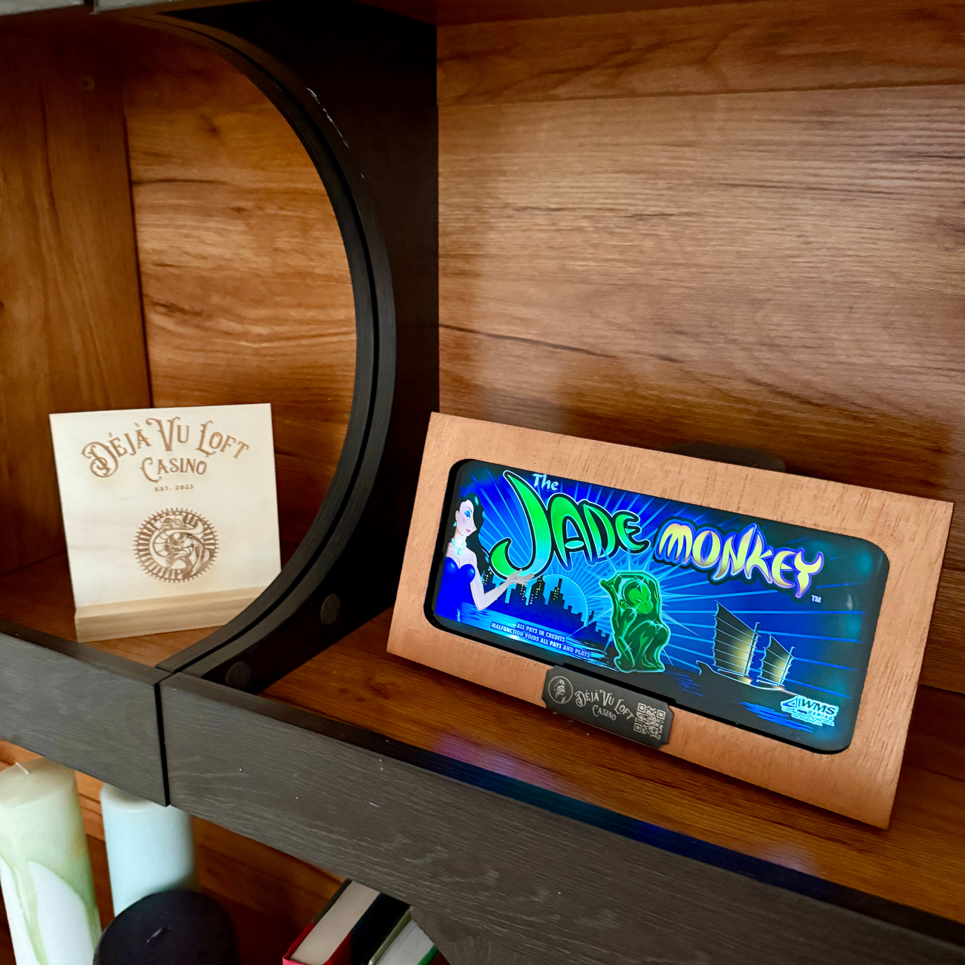 The Jade Monkey Slot Glass is a sleek and mysterious piece featuring the glowing green jade monkey at its center, with a glamorous woman and city skyline adding intrigue. Its rich nighttime palette and exotic allure make it a standout display item for vintage slot lovers and collectors of rare casino art.