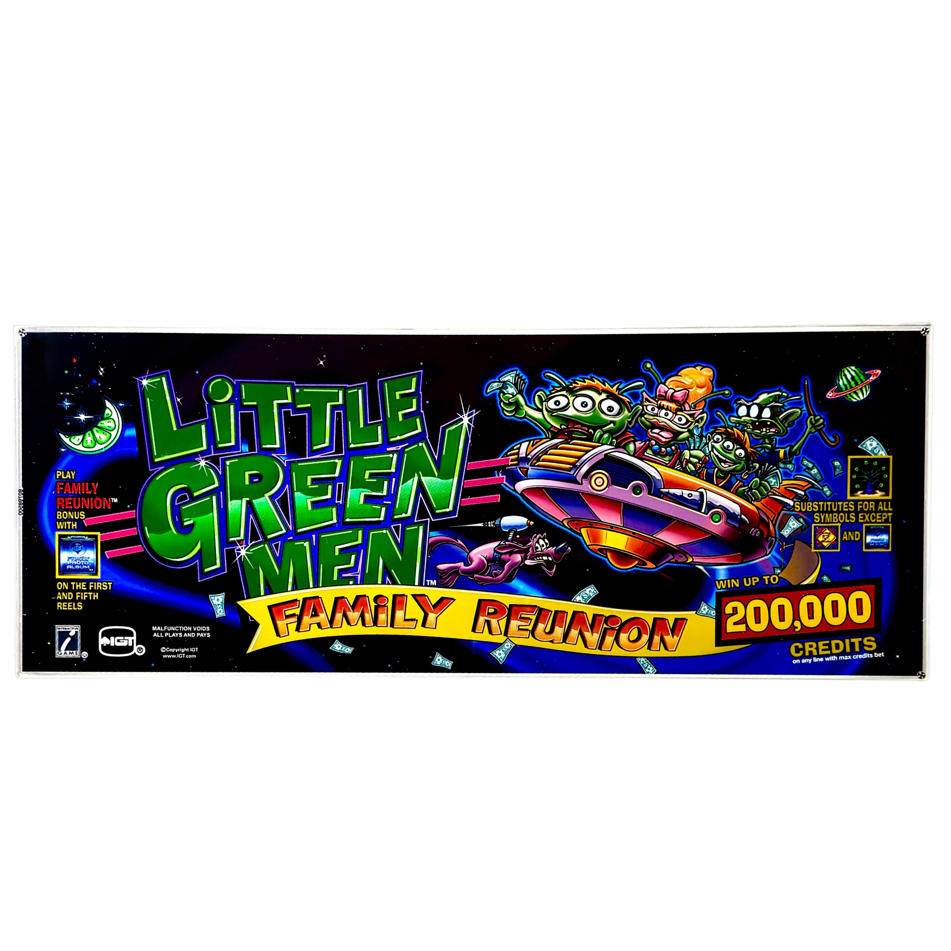 Blast off into fun with the Little Green Men Family Reunion Vintage Slot Machine Glass! This vibrant and whimsical design features quirky little green aliens zooming through space in a colorful spaceship, capturing the playful spirit of an intergalactic family gathering. With its bold neon lettering and cosmic details, this piece is perfect for adding a pop of retro sci-fi charm to your game room, home bar, or vintage decor collection. Let this nostalgic glass art take you on a lighthearted journey across the stars and bring out-of-this-world excitement into your space!