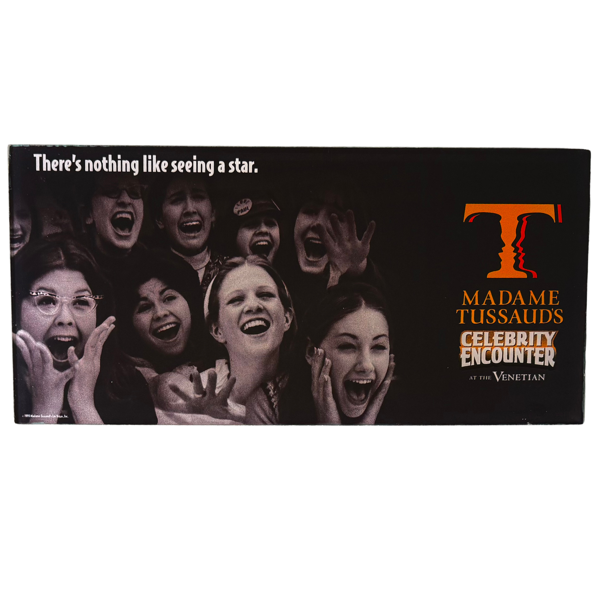 Capture the excitement of stardom with the Madame Tussaud's Celebrity Encounter Vintage Slot Machine Glass! This sophisticated design features a crowd of ecstatic fans in a vintage black-and-white style, reflecting the thrill of seeing a star up close. With its bold orange and white lettering and the iconic Madame Tussaud's logo, this piece adds a touch of glamour and nostalgia to any game room, home bar, or vintage decor collection. Let this striking artwork transport you to the dazzling world of celebrities and unforgettable encounters!