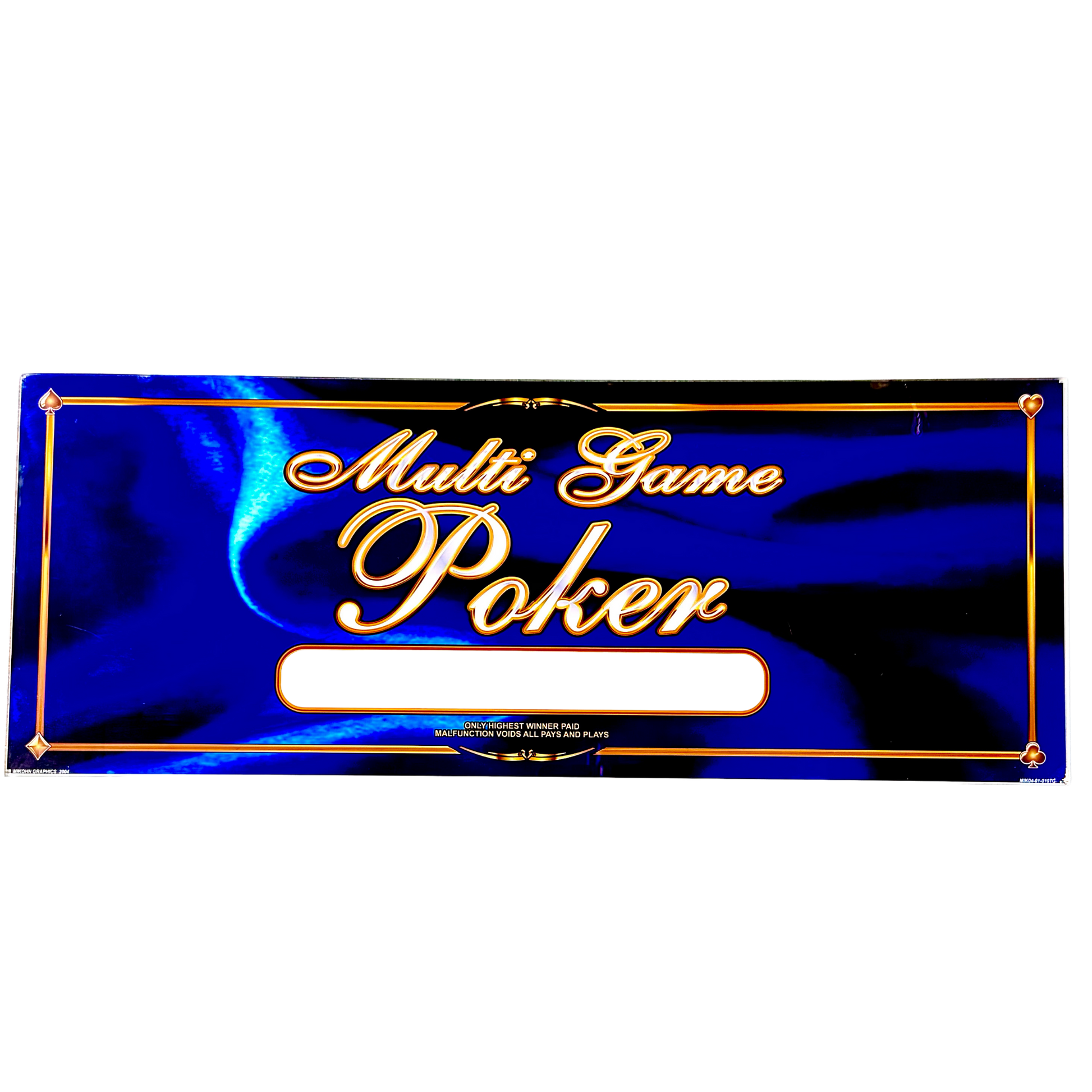 The Multi Game Poker Slot Glass is a refined and timeless piece, showcasing an elegant royal blue background with golden lettering and decorative accents. This slot glass represents the classic allure of video poker, making it a perfect addition for collectors, gaming enthusiasts, or as a sleek décor piece for a home game room or bar. The polished design captures the sophistication and excitement of casino poker, making it an ideal display item for those who appreciate the nostalgia of vintage gaming aesthetics.