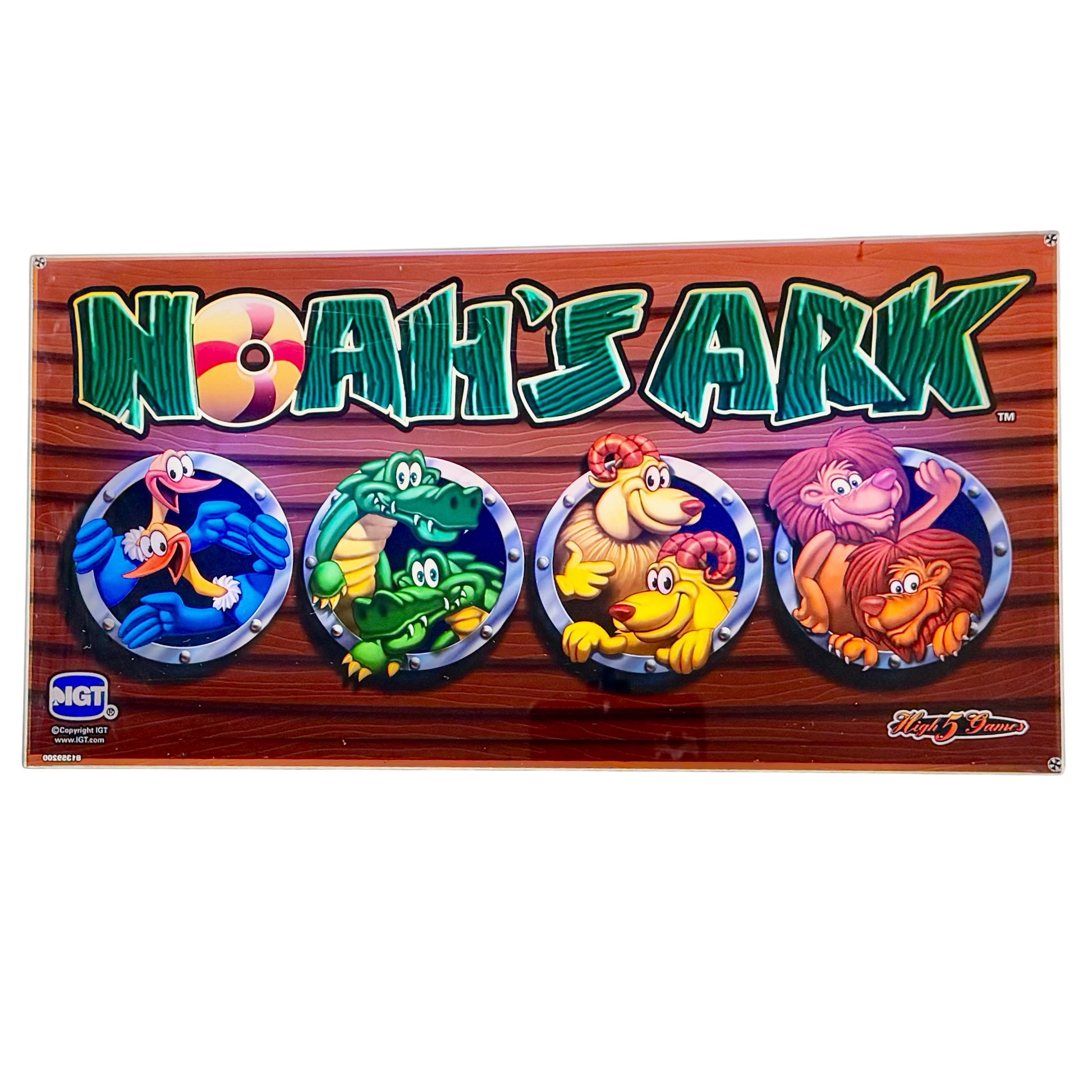 The Noah's Ark Slot Glass features a whimsical design with animated animal pairs peeking through portholes, set against a wood-textured background. This vibrant and nostalgic piece is perfect for collectors or as a unique decor item for any casino or vintage gaming enthusiast.