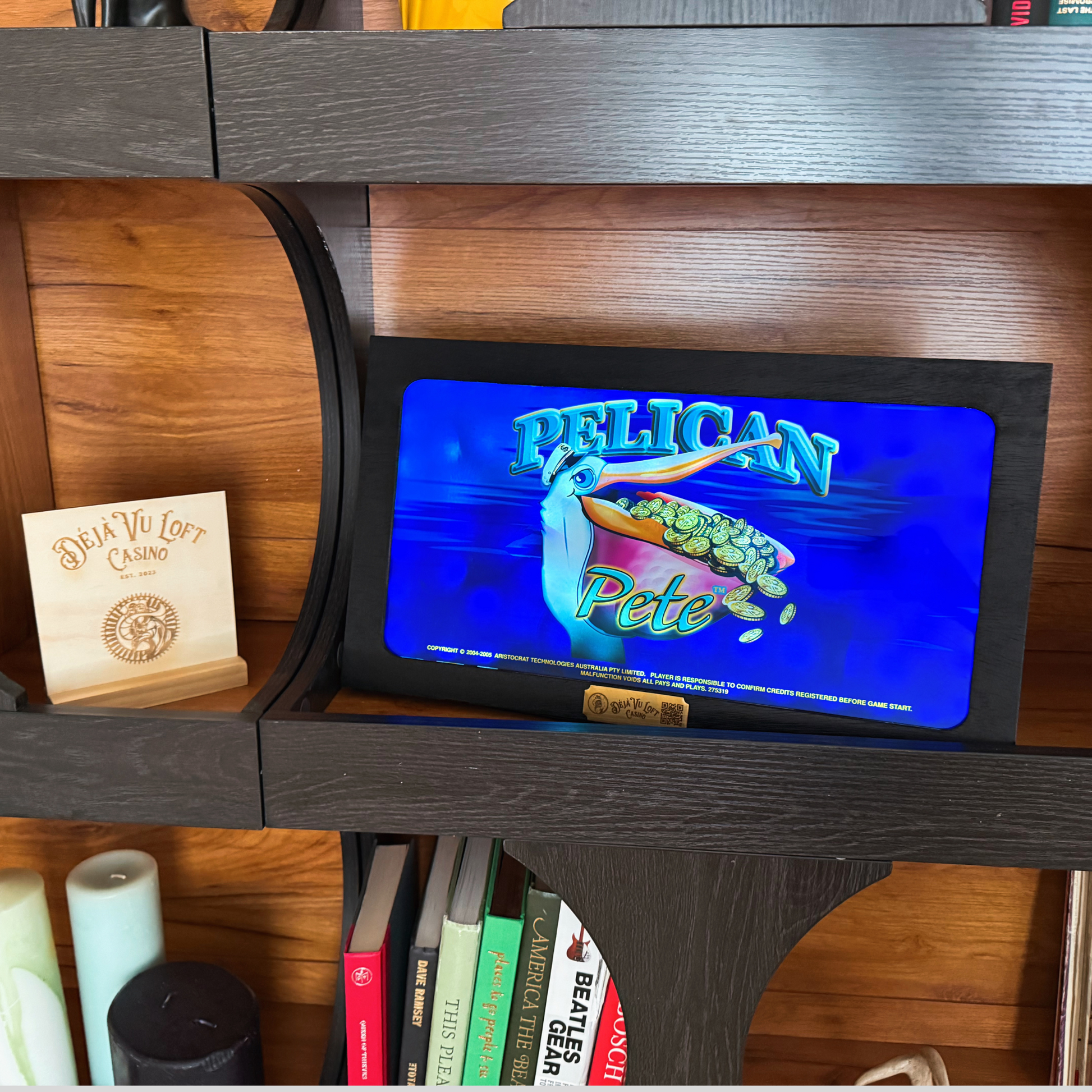 The Pelican Pete Slot Retro Acrylic is a coastal classic featuring the iconic gold-filled pelican against a rich ocean-blue backdrop. With shimmering coins pouring from its bill, this piece radiates beachside luck and tropical fun. A charming addition for casino decor collectors and lovers of nautical nostalgia.