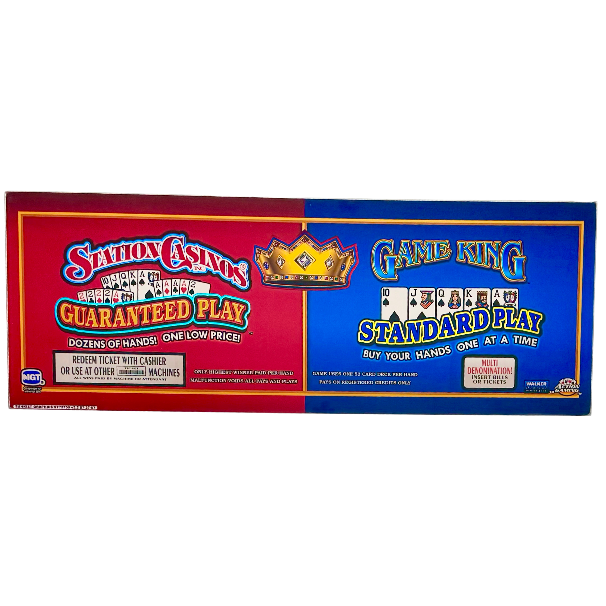 A unique two-in-one collectible, the Station Casinos Game King Slot Glass features both “Guaranteed Play” and “Standard Play” side by side—boldly split into a vibrant red and blue design. This piece celebrates multi-hand poker and the legendary Game King format, perfect for any vintage casino enthusiast or video poker lover’s display.