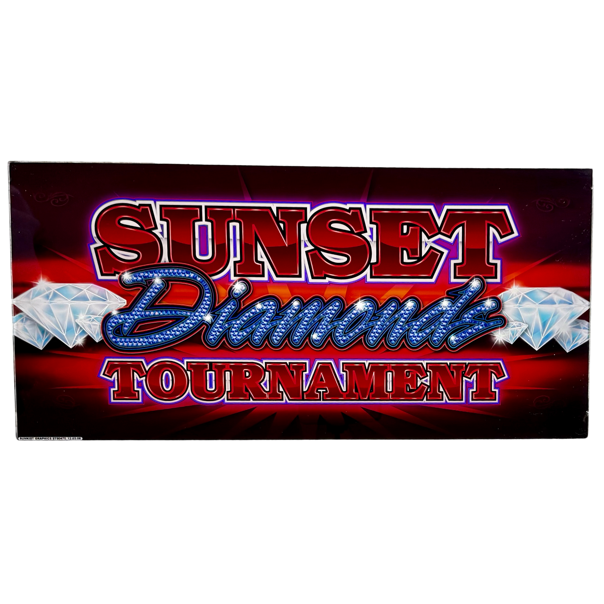 The Sunset Diamondz Tournament Slot Glass radiates glitz and competition, featuring brilliant diamonds, rich red hues, and bold tournament-style typography. Its sparkling design captures the excitement of high-stakes slot play at dusk, making it a striking decor piece for collectors, game room displays, or anyone who loves the dazzle of casino nights.