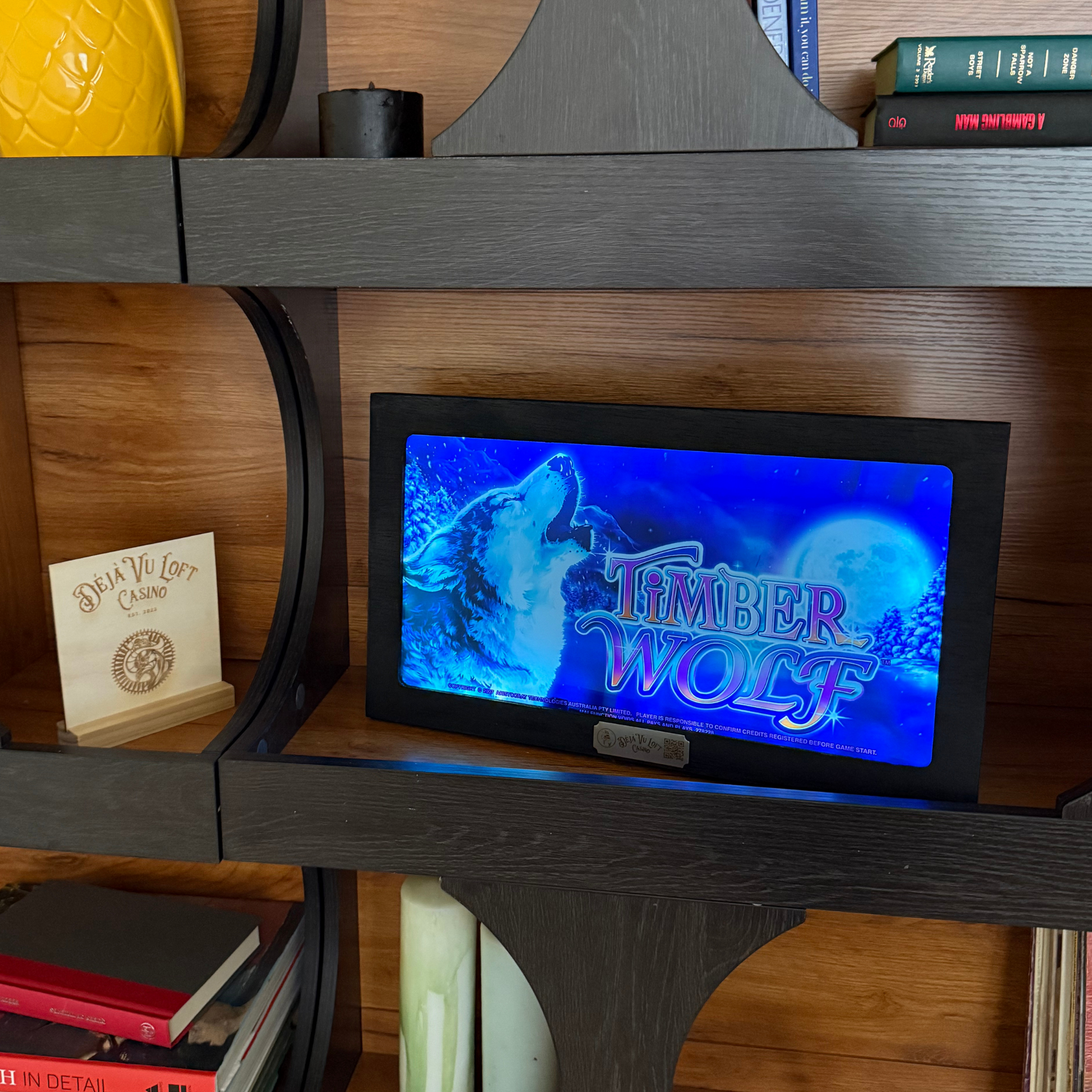 The Timber Wolf Slot Retro Acrylic captures the haunting beauty of the wilderness with a majestic wolf howling beneath a glowing full moon. The icy blue tones and snow-covered forest background create an atmosphere of mystery and allure. A standout piece for nature lovers, collectors, or anyone drawn to the call of the wild and the thrill of vintage slot machines.