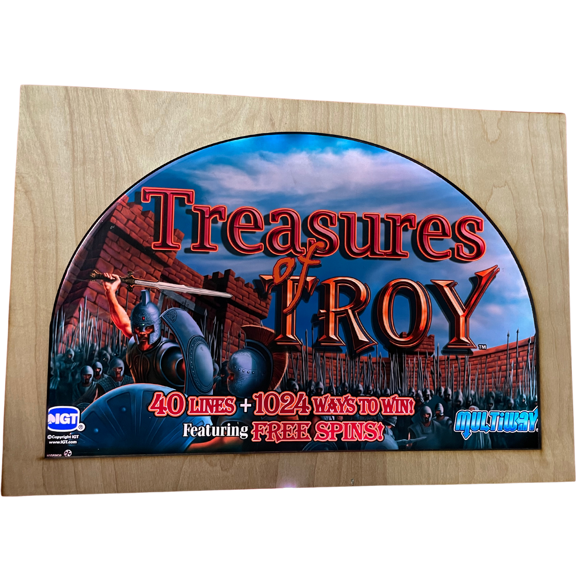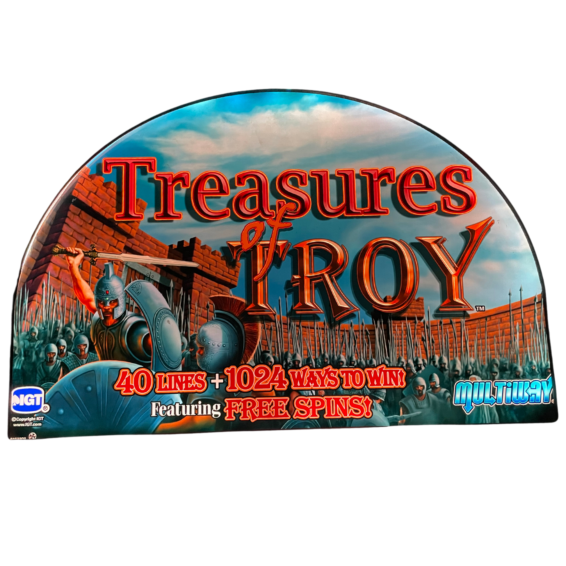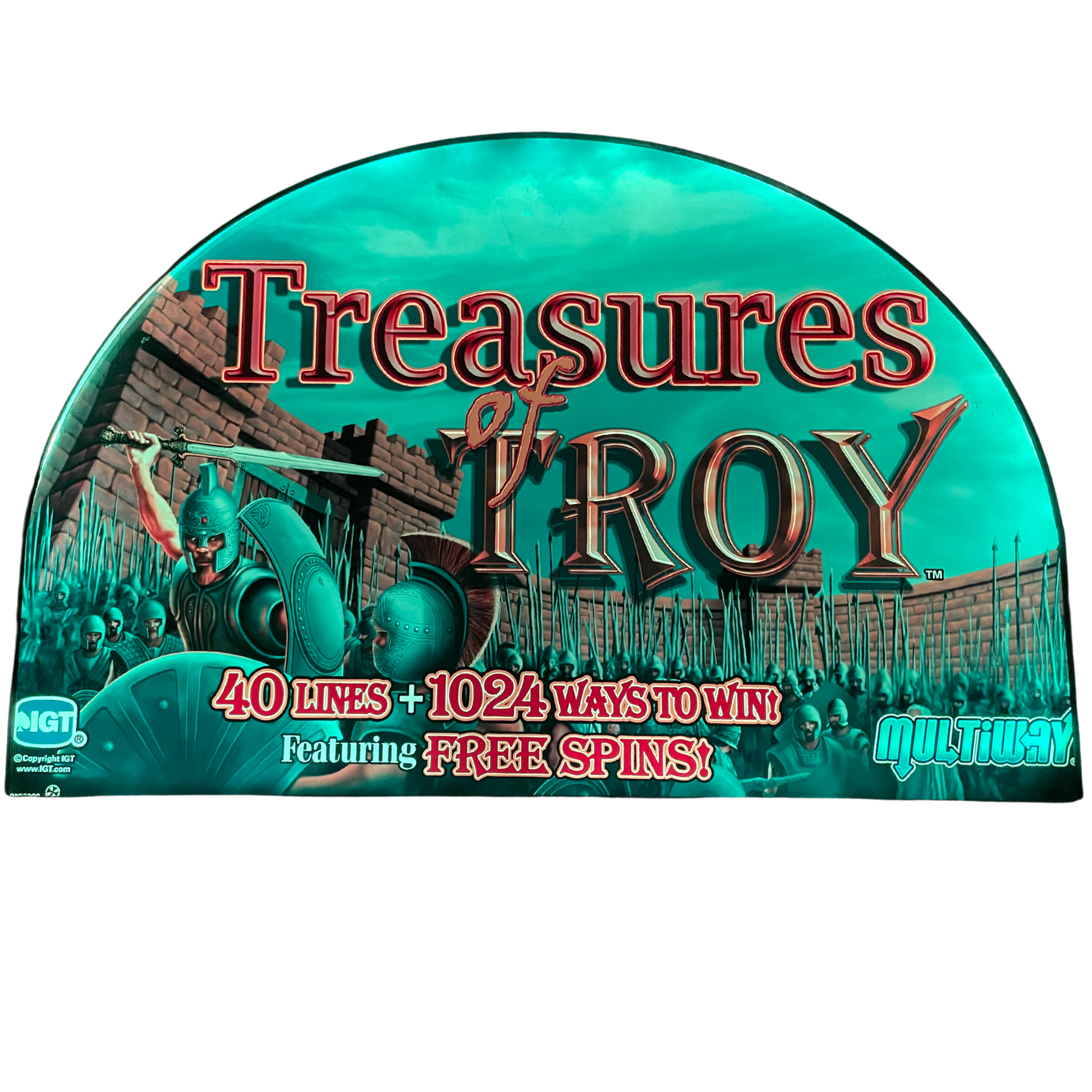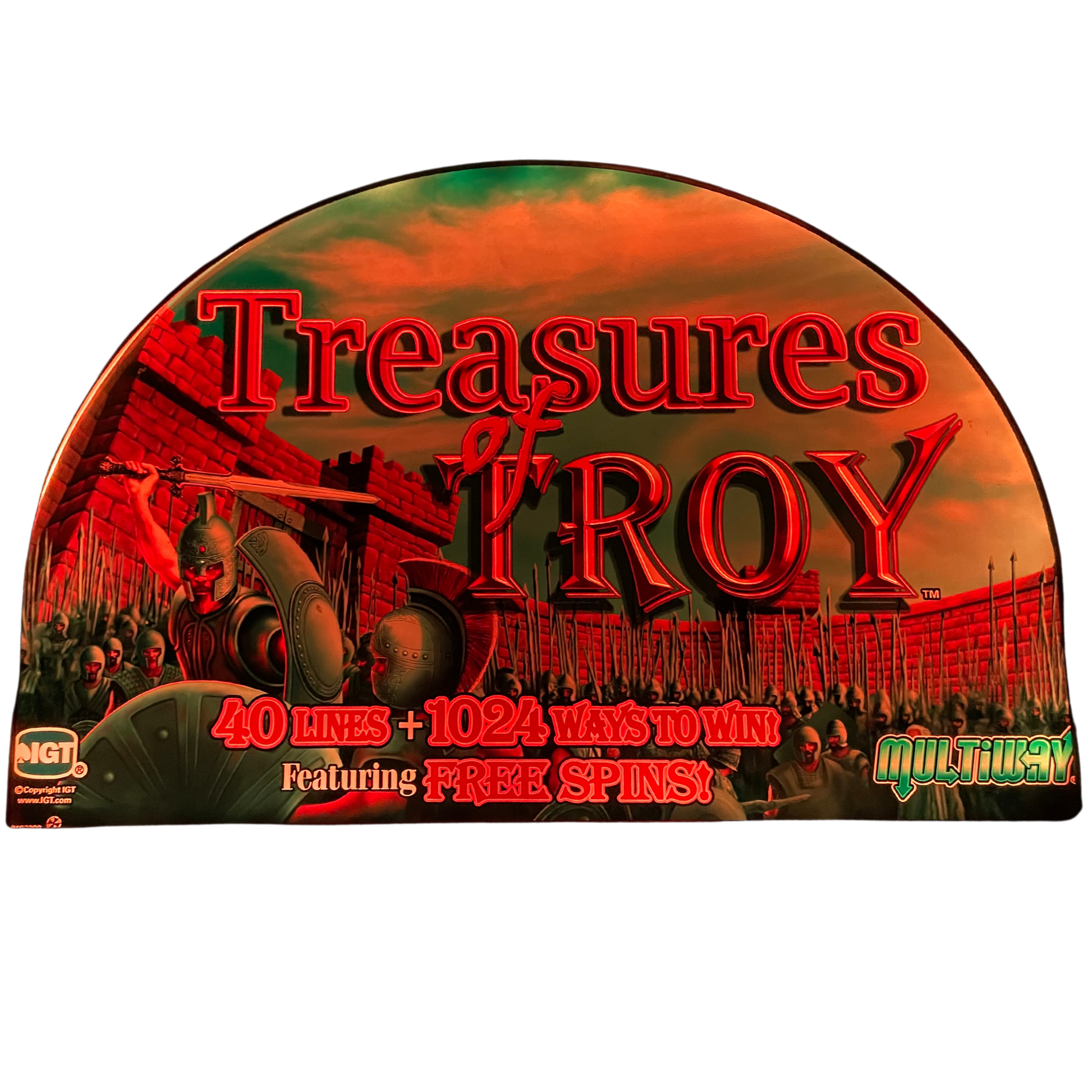 The "Treasures of Troy" slot machine brings the epic tale of the Trojan War to life with a richly detailed and action-packed design. The display features a dramatic scene of armored warriors ready for battle against the backdrop of the ancient city of Troy, with towering walls and determined soldiers setting the stage for an adventurous gaming experience.