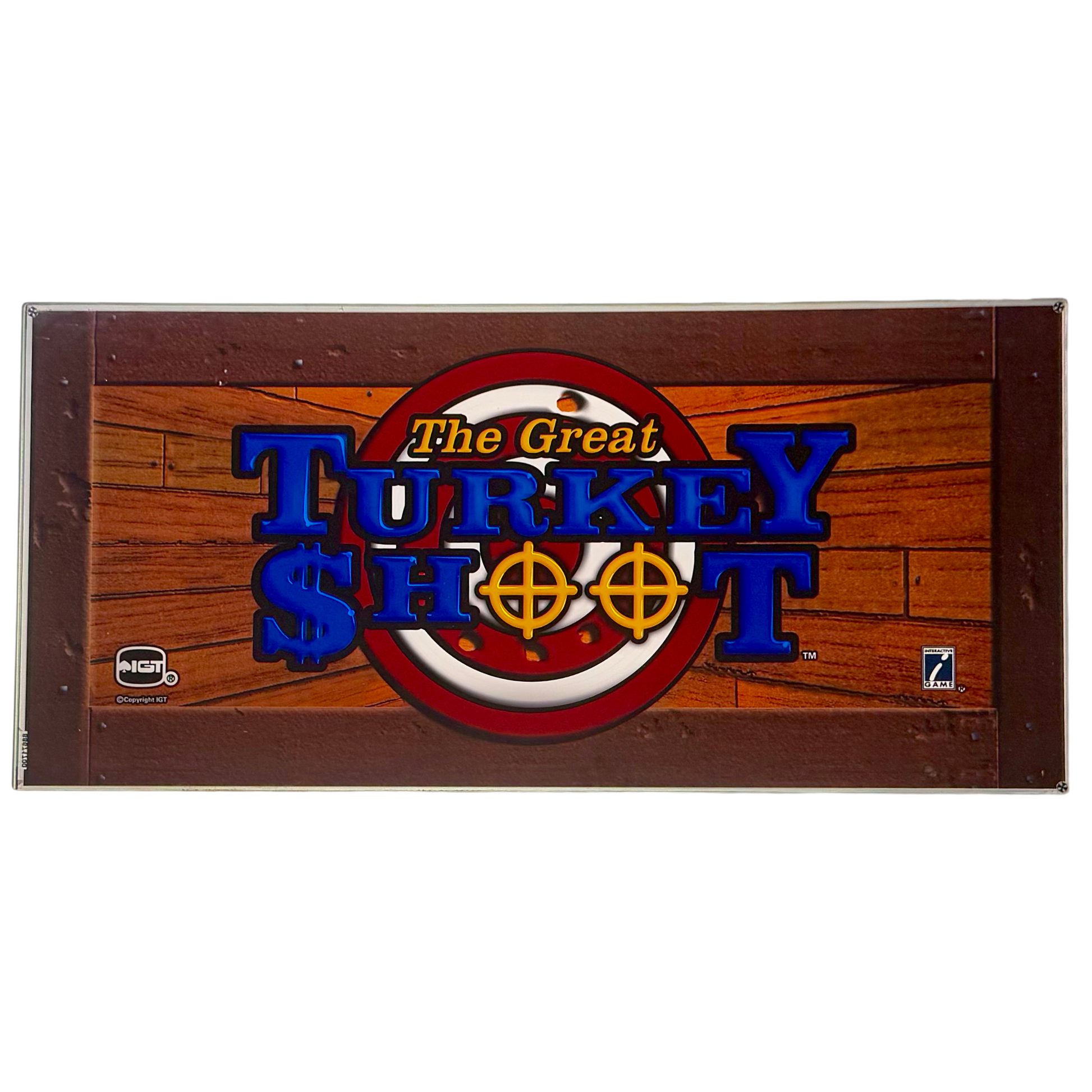 Add a touch of fun and nostalgia to your space with this Turkey Shoot Vintage Slot Machine Glass, featuring a bold bullseye target design set against a rustic wooden backdrop. The vibrant blue and red lettering, along with the playful shooting theme, perfectly captures the excitement of this classic slot game. Ideal for collectors, game room enthusiasts, or anyone looking to bring a unique vintage casino vibe to their decor. Take aim and add this piece to your collection today!
