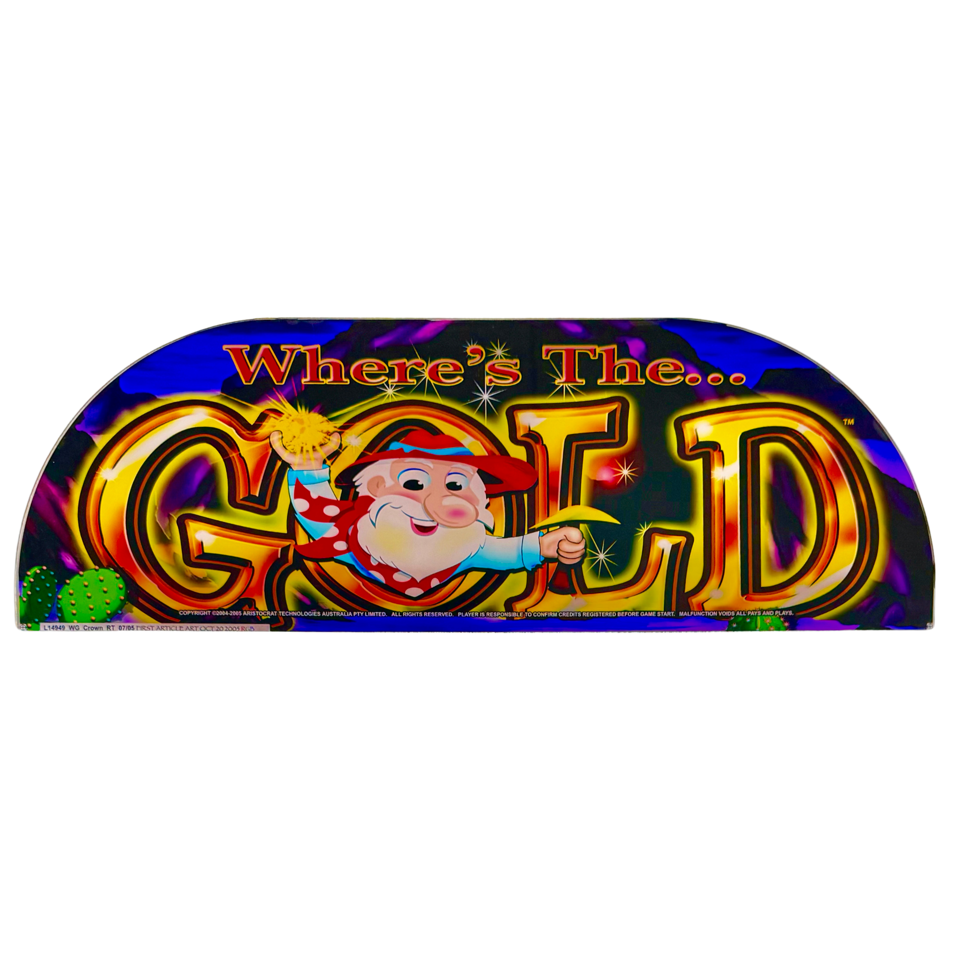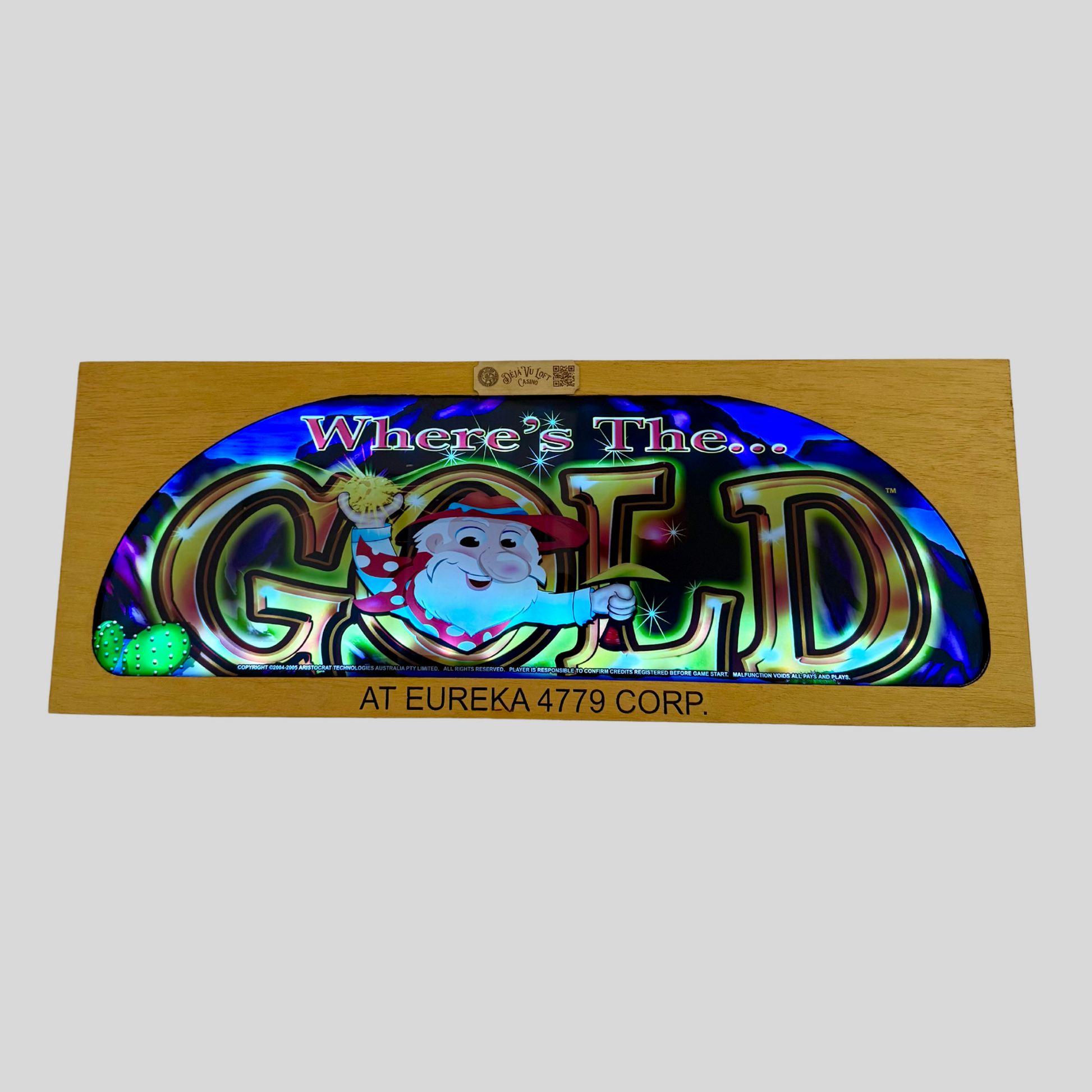 The Where’s The Gold Slot Retro Acrylic strikes it rich with charm and nostalgia. Featuring a cheerful gold miner, dazzling golden text, and a whimsical desert backdrop, this piece celebrates the thrill of the gold rush and vintage slot excitement. A golden pick for collectors and fans of iconic casino classics!