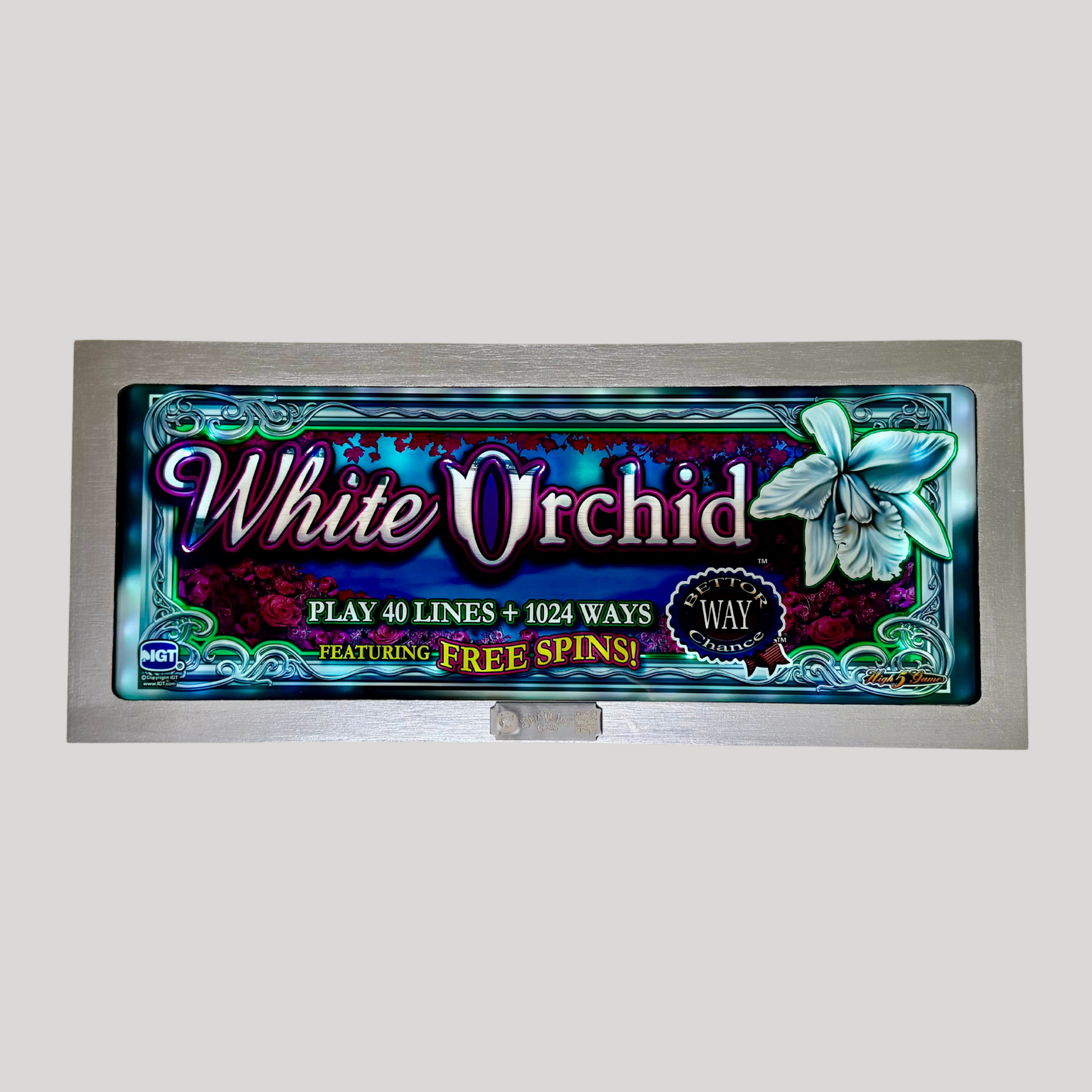 The White Orchid Slot Glass is an elegant and visually captivating piece featuring delicate floral elements with a rich color palette of deep pinks, blues, and silvers. The intricate border design and the striking white orchid create a sense of sophistication and serenity. With its ornate typography and luxurious aesthetic, this slot glass is an excellent choice for collectors, floral design enthusiasts, or anyone looking to add a touch of refined beauty to their décor.