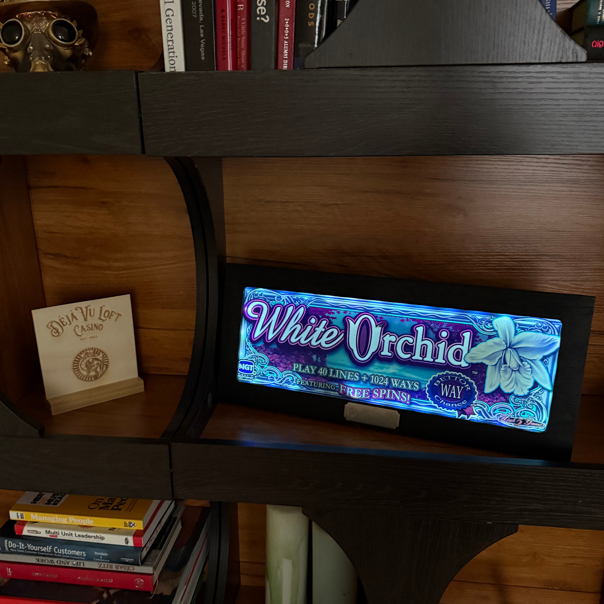 The White Orchid Slot Glass is an elegant and visually captivating piece featuring delicate floral elements with a rich color palette of deep pinks, blues, and silvers. The intricate border design and the striking white orchid create a sense of sophistication and serenity. With its ornate typography and luxurious aesthetic, this slot glass is an excellent choice for collectors, floral design enthusiasts, or anyone looking to add a touch of refined beauty to their décor.