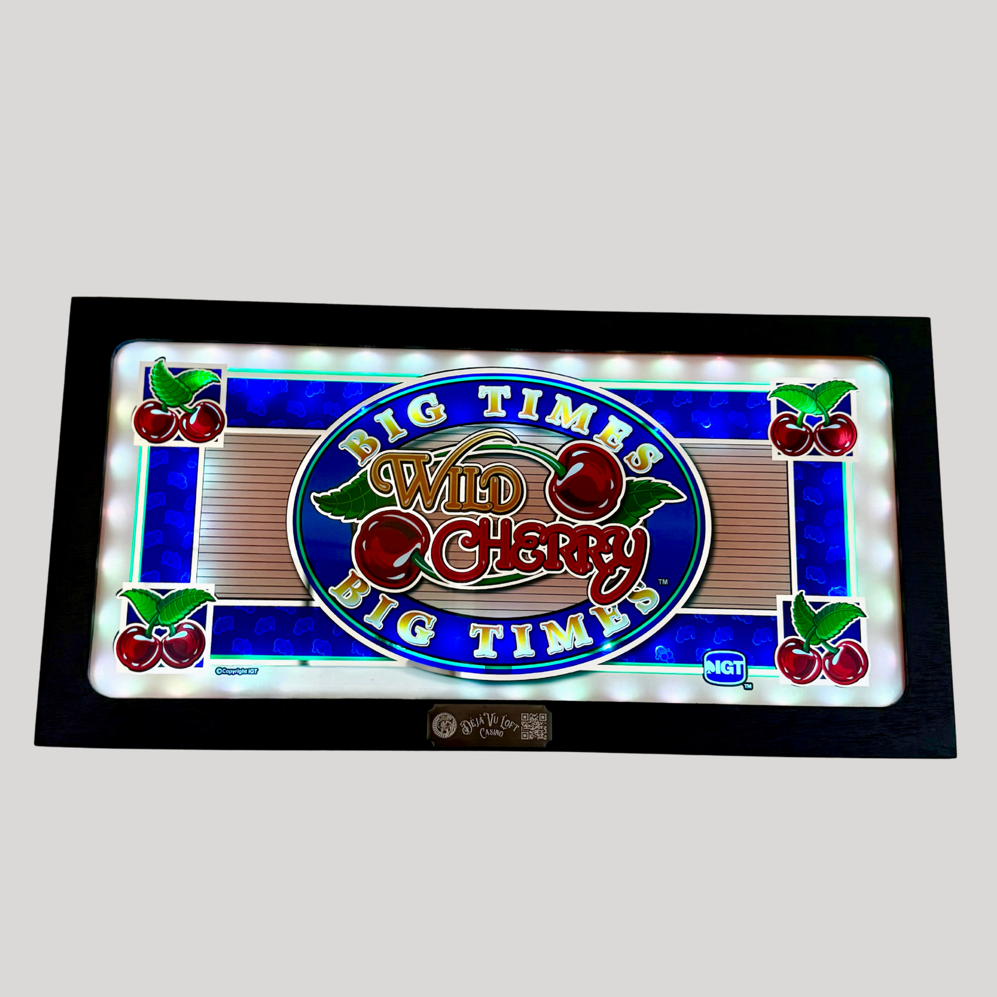 The Wild Cherry Big Times Slot Glass bursts with vintage fruit-machine charm. Bright red cherries and bold blue and orange tones frame a classic circular emblem, evoking the sweet nostalgia of old-school slots. Perfect for collectors or retro lovers who want to bring that timeless jackpot energy into their space.