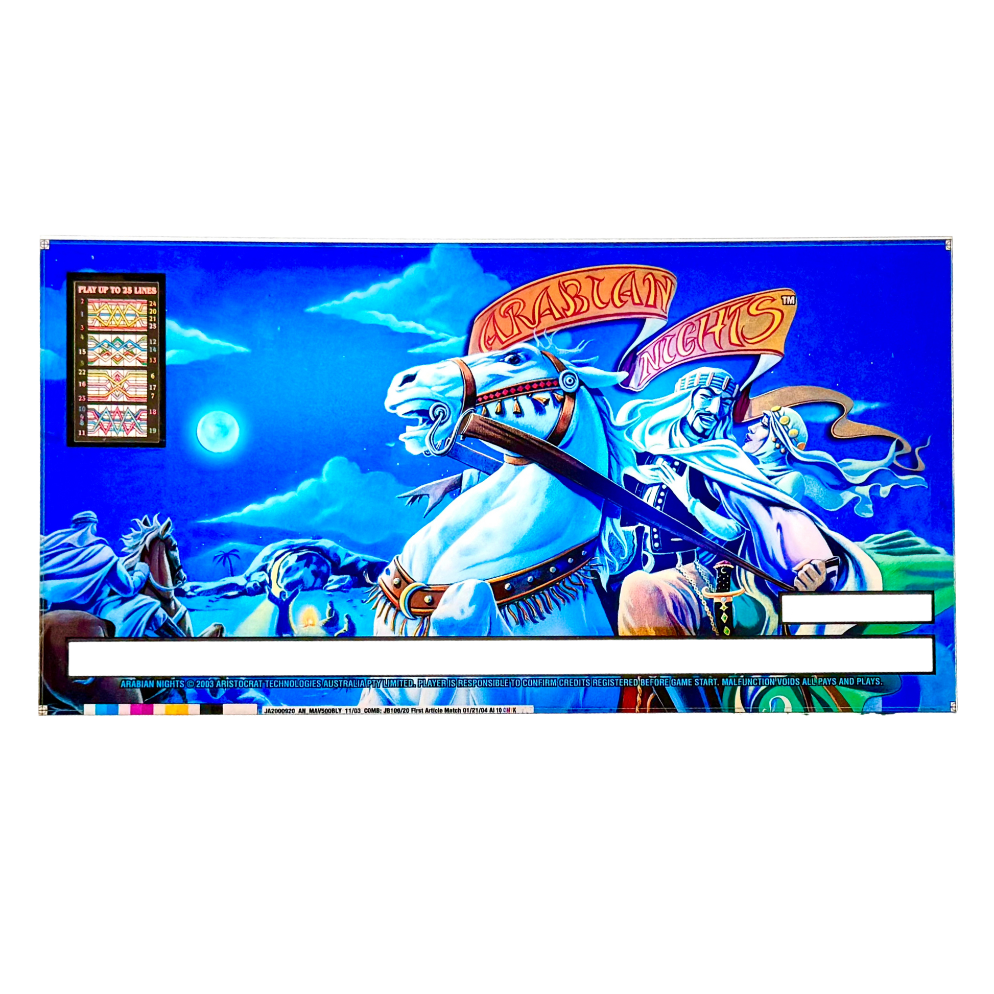 Introducing the Arabian Nights Slot Retro Acrylic, a mesmerizing piece that transports you to the exotic landscapes of Middle Eastern folklore. Featuring an enchanting night scene with a valiant rider and a galloping white steed, this slot glass captures the spirit of adventure and mystery. The deep blue hues and intricate details evoke the magic of the legendary tales, making it a perfect addition for collectors, nostalgia enthusiasts, or anyone looking to infuse their space with a touch of Arabian mystique. Ideal for display in game rooms, bars, or themed spaces, this piece is a timeless tribute to the allure of classic casino design.