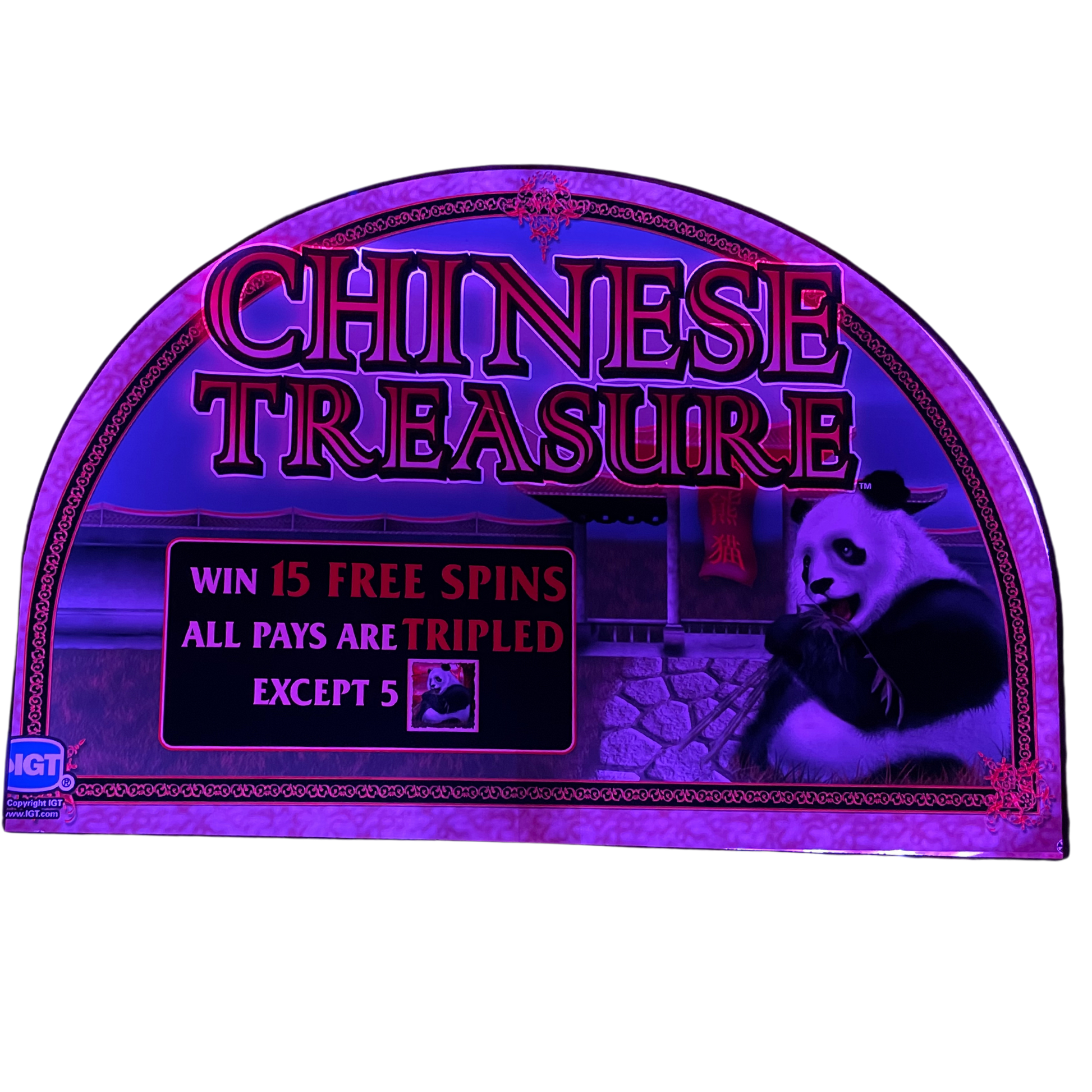 The "Chinese Treasure" slot machine immerses players in the serene and culturally rich world of ancient China. The display features a charming panda munching on bamboo, set against a picturesque backdrop of traditional Chinese architecture and lush greenery. The overall design is framed with intricate patterns, enhancing the cultural aesthetic.