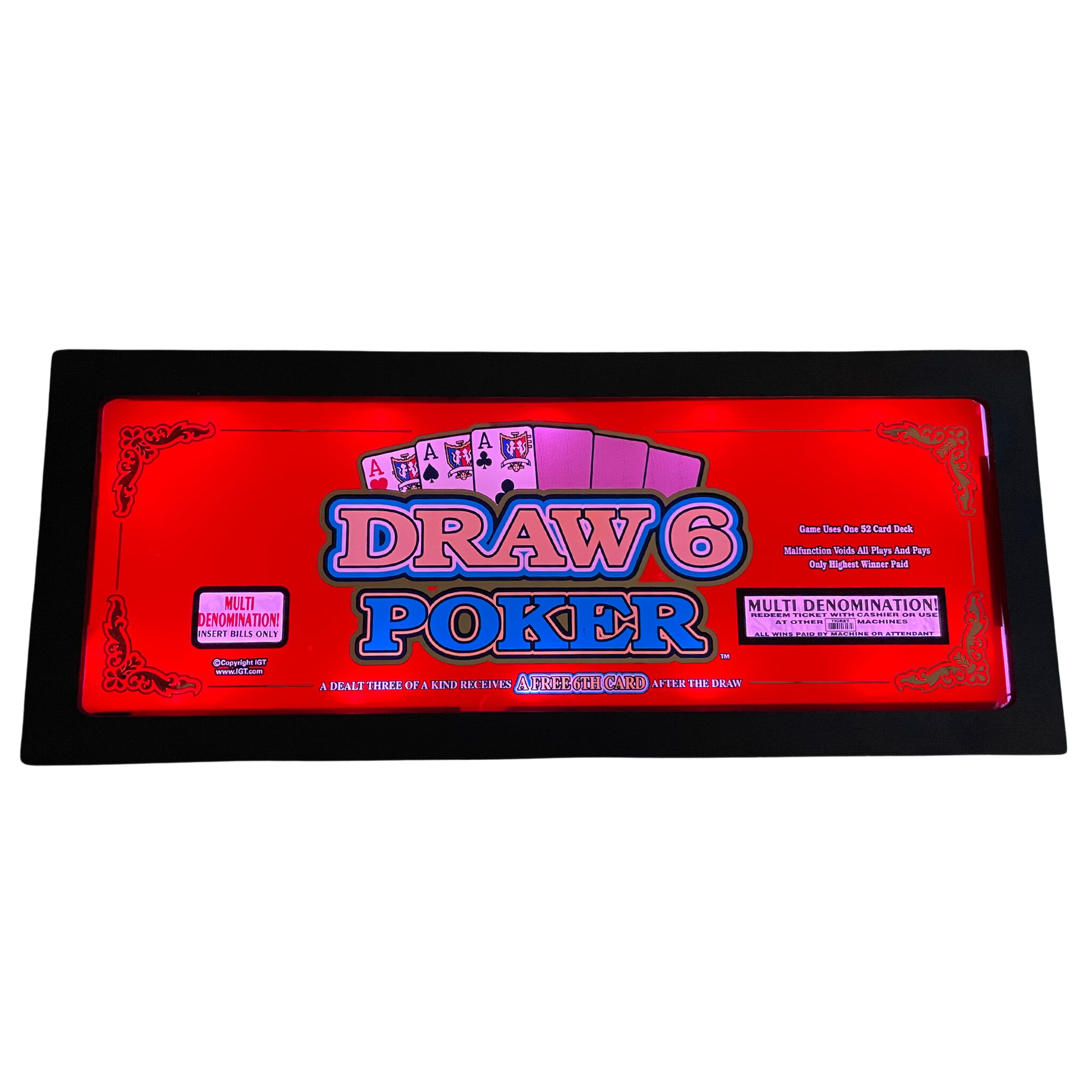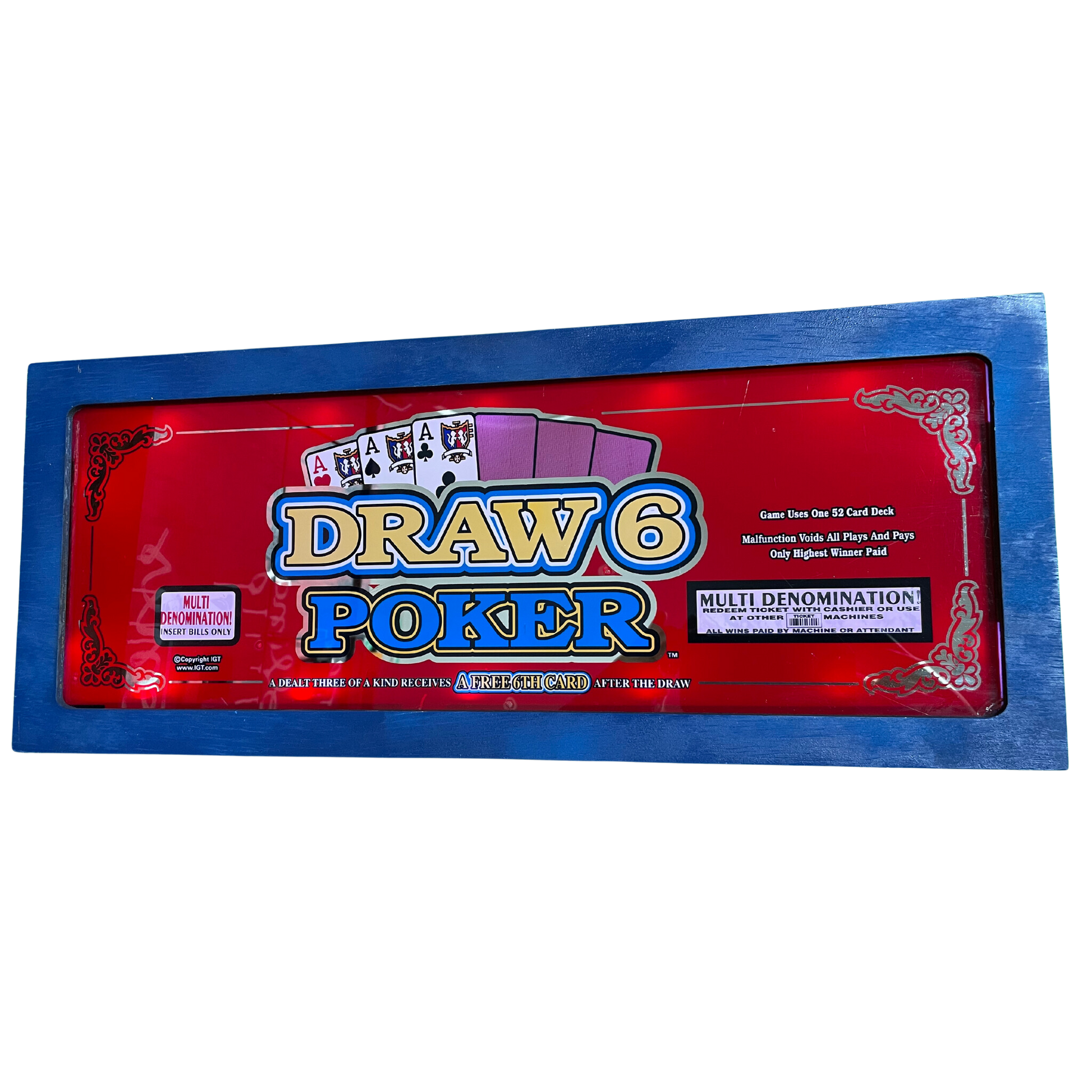 Experience the classic allure of poker with a twist with the "Draw 6 Poker" slot glass! This eye-catching piece features a vibrant red background adorned with elegant corner details, setting the stage for an exciting game. The bold lettering and dynamic design emphasize the unique aspect of this game—receiving a bonus 6th card for a dealt three of a kind, adding an extra layer of strategy and thrill. Perfect for game rooms, poker nights, or any space that celebrates the excitement of casino gaming, this authentic slot machine glass is a fantastic addition for collectors and vintage decor enthusiasts. Let "Draw 6 Poker" bring a touch of classic casino excitement and sophistication to your decor!