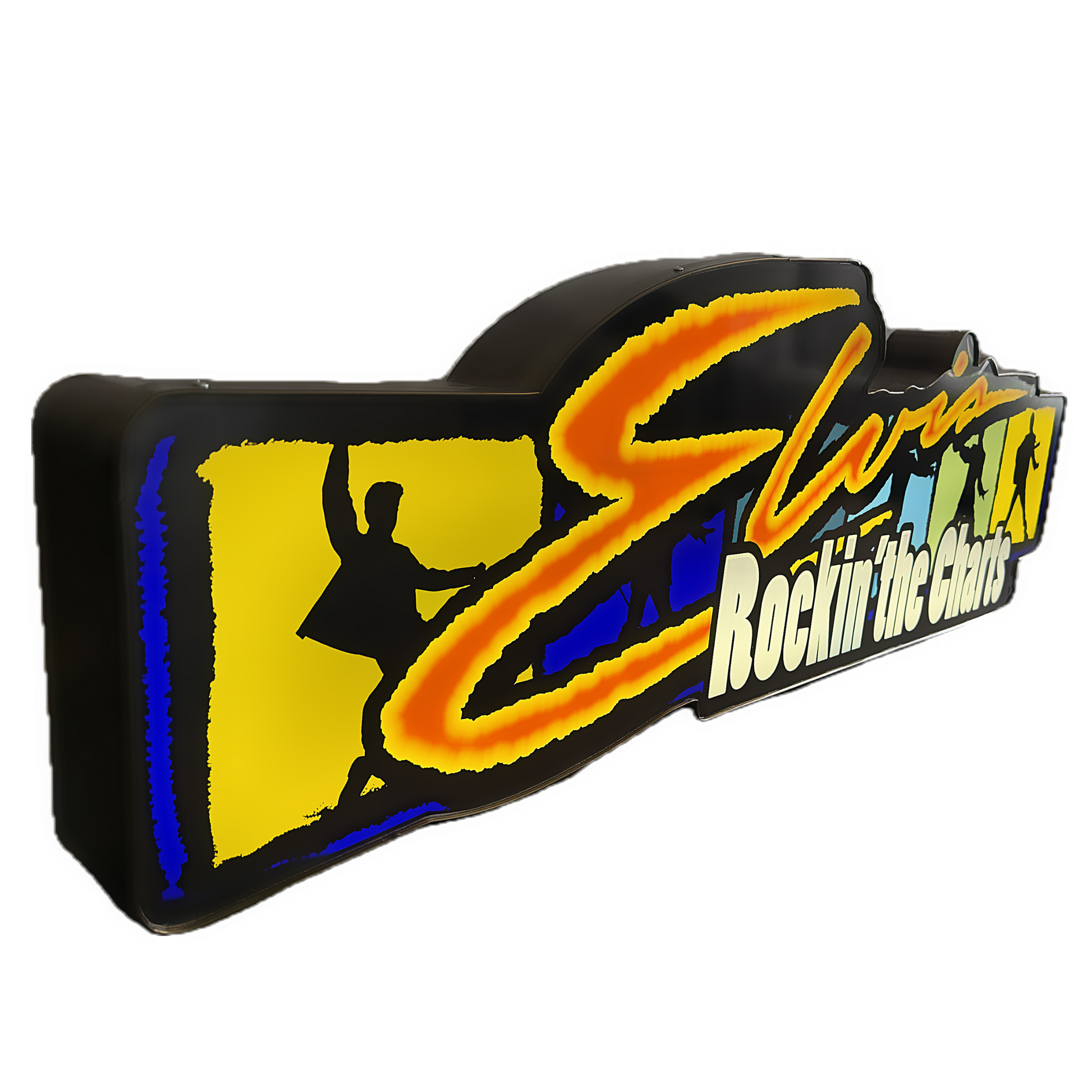 Bring instant Vegas showtime energy to your space with this Elvis “Rockin’ the Charts” slot topper. Featuring the iconic, flame-style Elvis signature across a neon-bright stage backdrop—complete with performance silhouettes—this piece is pure casino-era nostalgia. A standout accent for a music room, bar, studio, game room, or themed display, and an easy base for creative builds and custom installations.