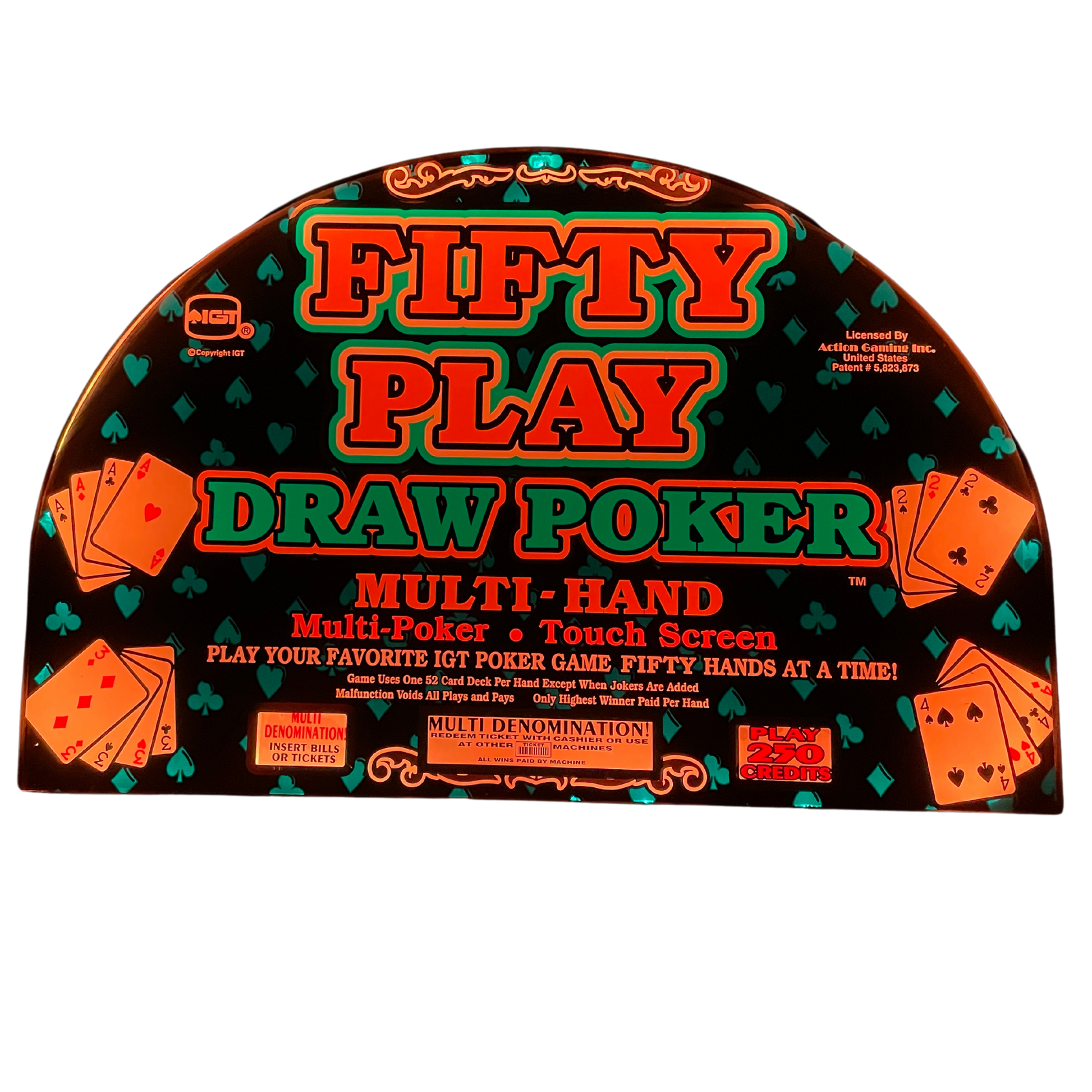The "Fifty Play Draw Poker" slot machine is designed for poker enthusiasts who enjoy playing multiple hands simultaneously. This machine features a sleek, casino-themed design with a dark background adorned with card suit symbols and images of playing cards, enhancing the poker atmosphere.