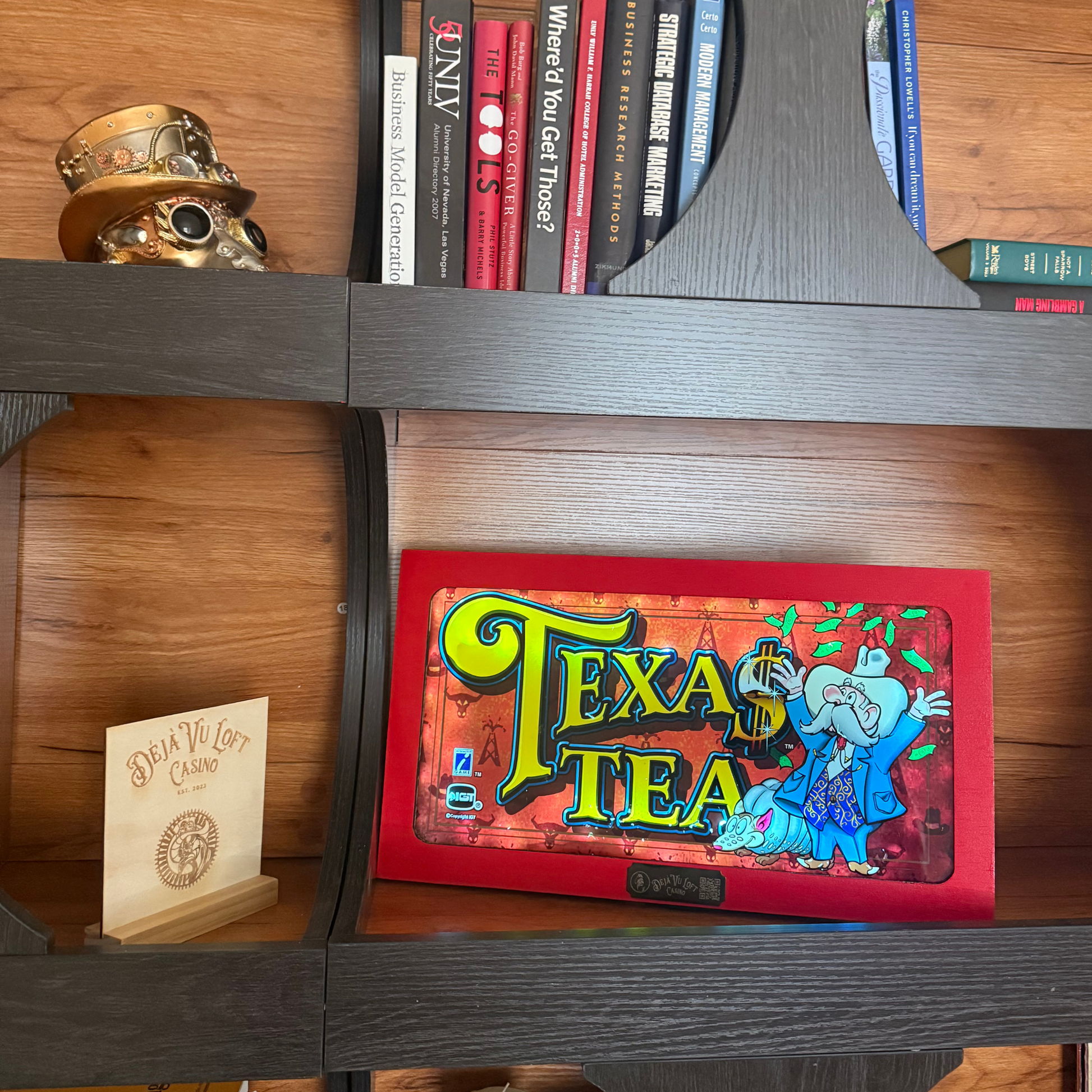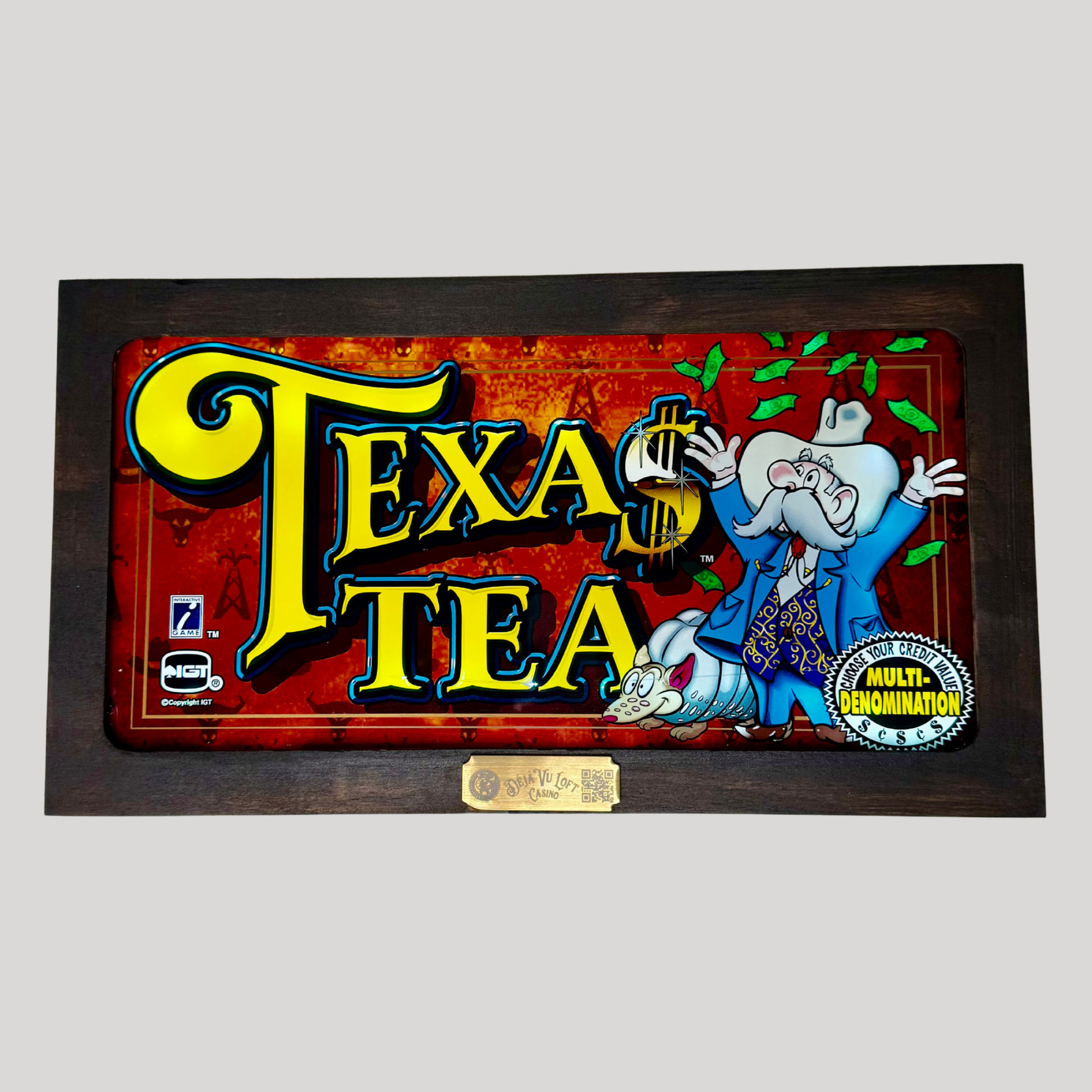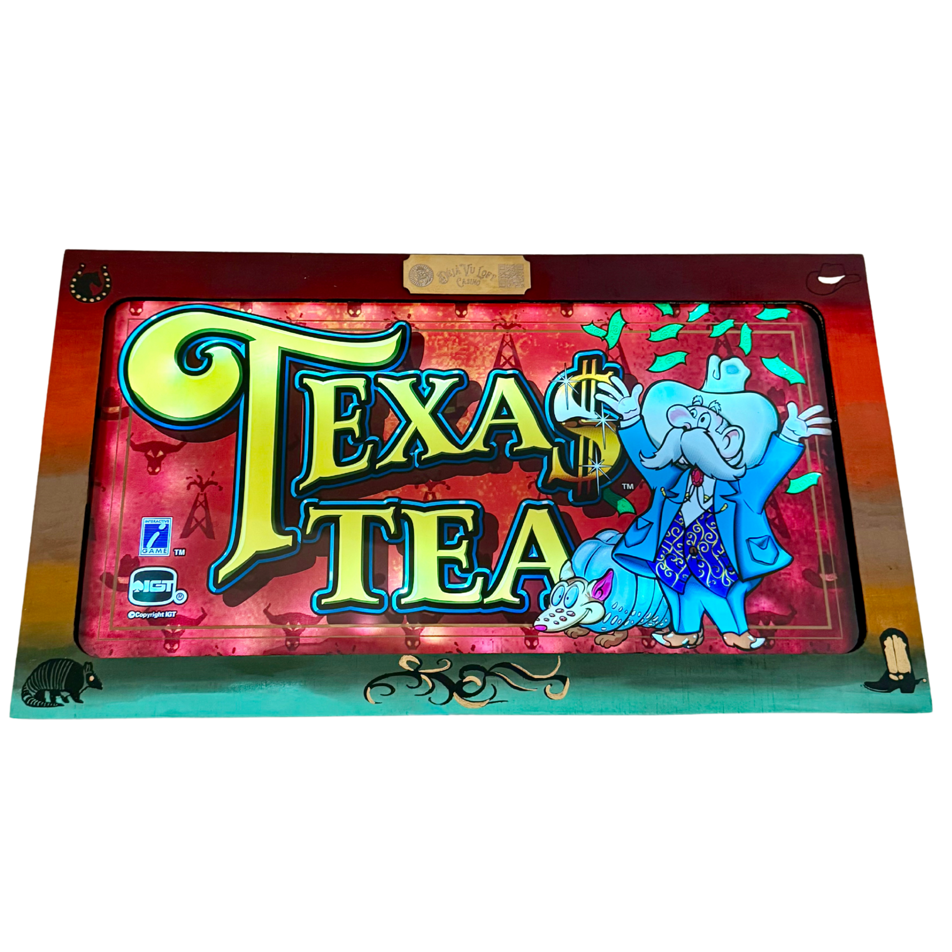 The Texas Tea Slot Glass features a vibrant and playful design inspired by the riches of oil country. With its bold lettering, animated characters, and classic casino aesthetic, this piece is perfect for collectors or as a nostalgic decor item.