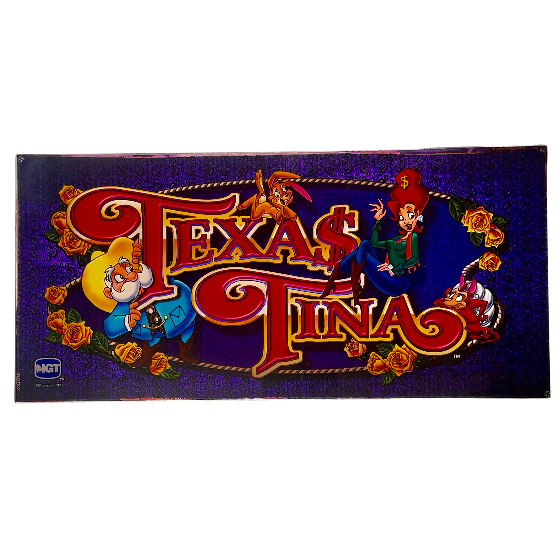 Bring a touch of Southern charm to your collection with this Texas Tina Vintage Slot Machine Glass, showcasing a bold Western-inspired design with vibrant purple and gold tones, whimsical character illustrations, and intricate floral accents. The playful depiction of Texas Tina and her lively crew adds a unique flair, making it a perfect addition for collectors, game rooms, or anyone who loves vintage casino decor with a Wild West twist. Lasso this delightful piece for your collection today!