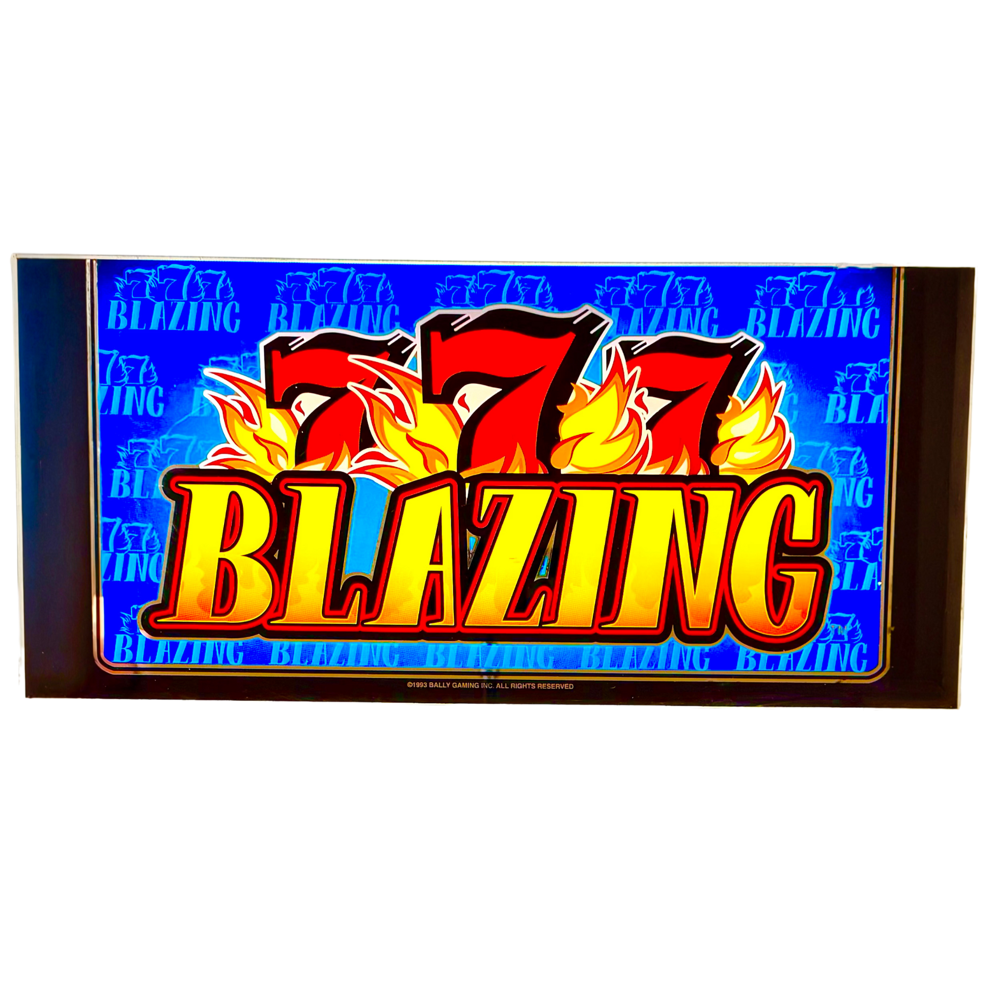 The 777 Blazing Slot Glass is a stunning and vibrant piece that showcases the fiery excitement of classic slot gaming. Featuring bold red "777" symbols engulfed in flames against a striking blue background, this Bally design captures the thrill of big wins and fast-paced casino action. The large, illuminated "Blazing" text enhances the dynamic aesthetic, making this slot glass a perfect addition for collectors, gaming enthusiasts, or as a standout décor piece for a game room or man cave.