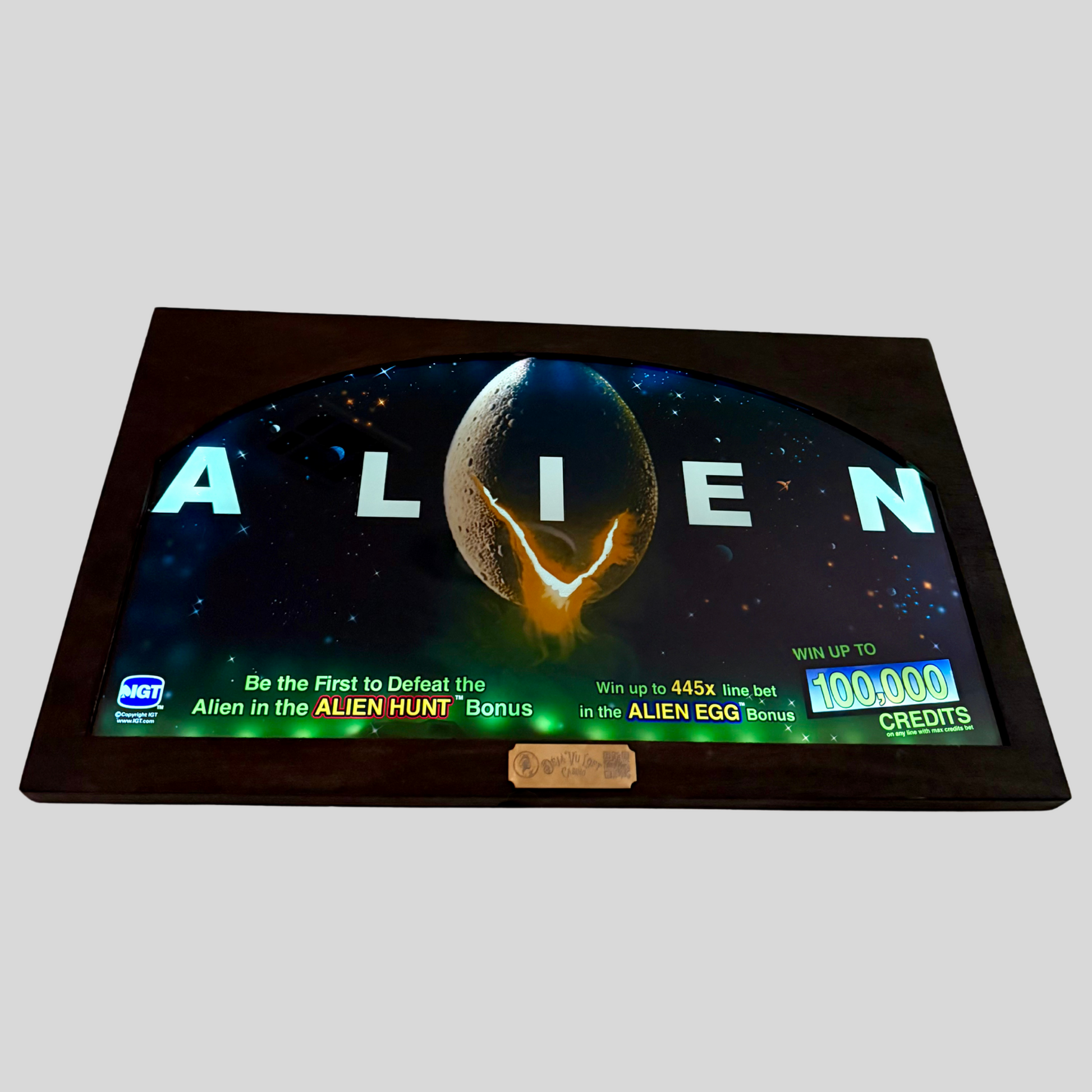 The Alien Egg Slot Glass features a haunting and atmospheric design inspired by the legendary sci-fi horror franchise. The imagery of the glowing, cracked alien egg set against a cosmic backdrop creates an eerie sense of mystery and suspense. The bold, minimalist typography enhances the futuristic aesthetic, making this an ideal piece for collectors of sci-fi memorabilia or fans of classic arcade and casino themes. A perfect addition to any space that appreciates cinematic nostalgia and dark, otherworldly design.