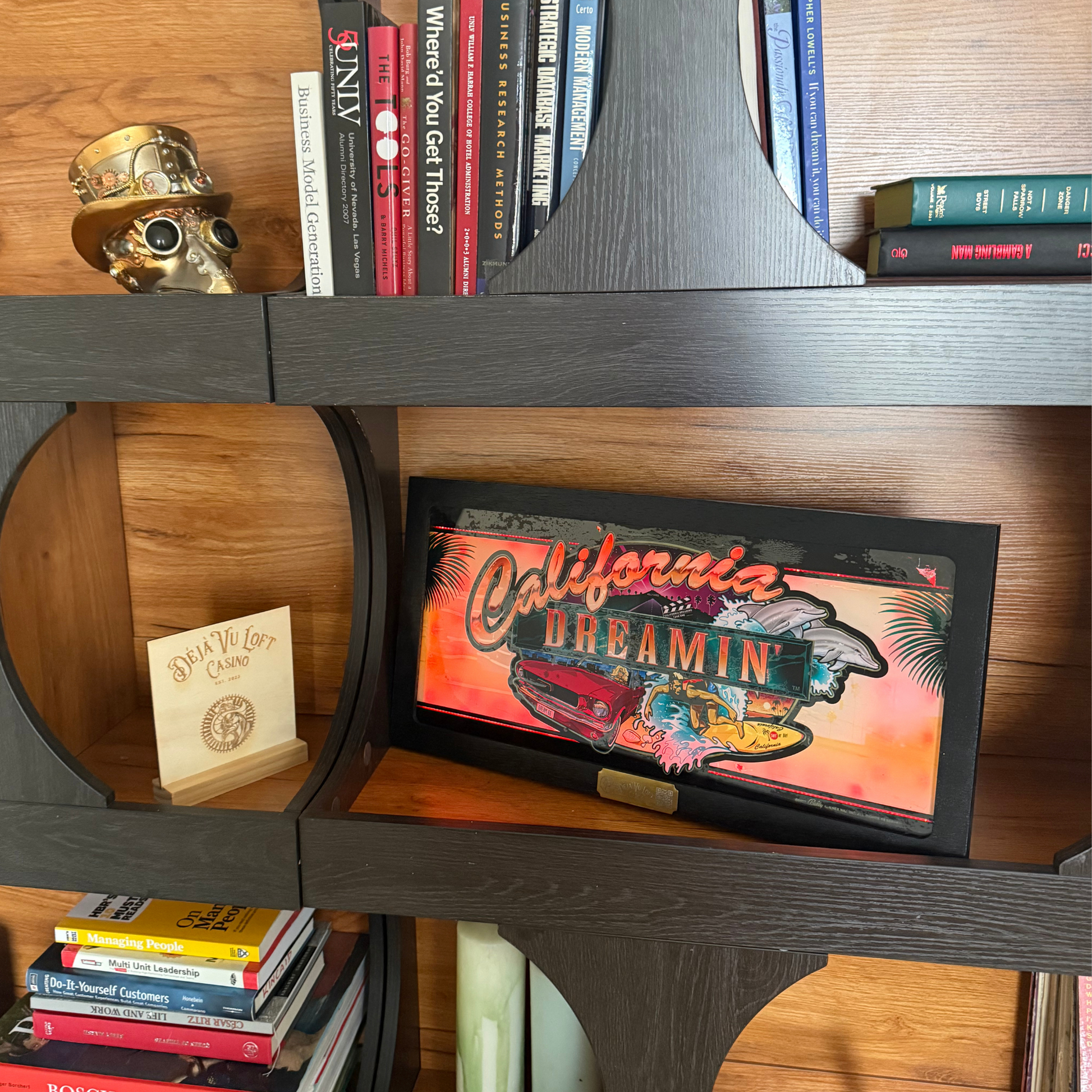 Introducing the California Dreamin' Slot Glass, a vibrant tribute to the golden state’s sun-soaked lifestyle. Featuring a classic red Mustang cruising down the highway, a surfer catching waves, and palm trees framing a golden sunset, this piece radiates the essence of California’s beach culture and laid-back charm.