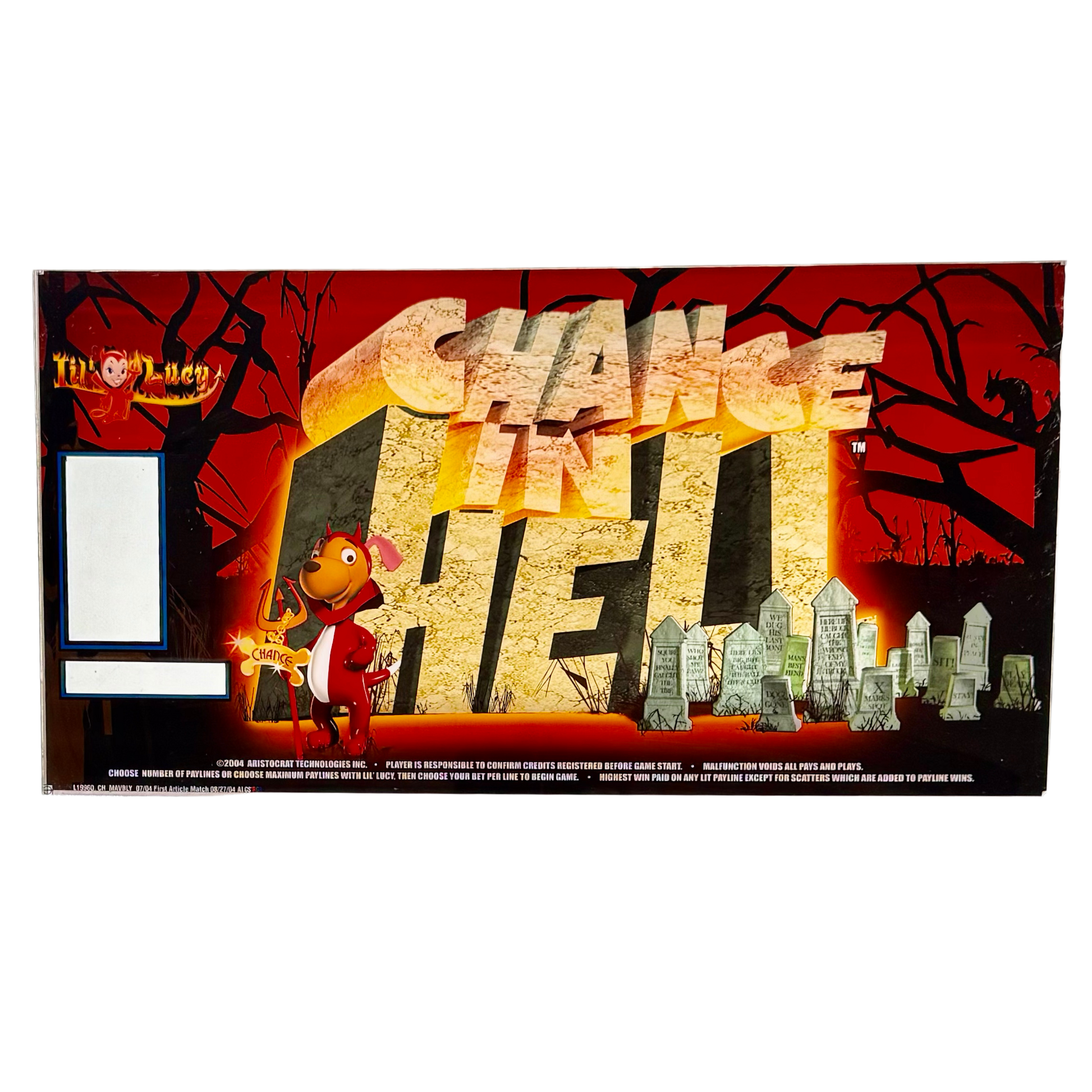 The Chance in Hell Slot Retro Acrylic brings devilish charm and bold humor to life with its fiery lettering, cartoonish devil dog, and eerie graveyard setting. A standout piece for those who love edgy, rare slot themes, it’s perfect for collectors with a mischievous streak or a darkly playful game room aesthetic.