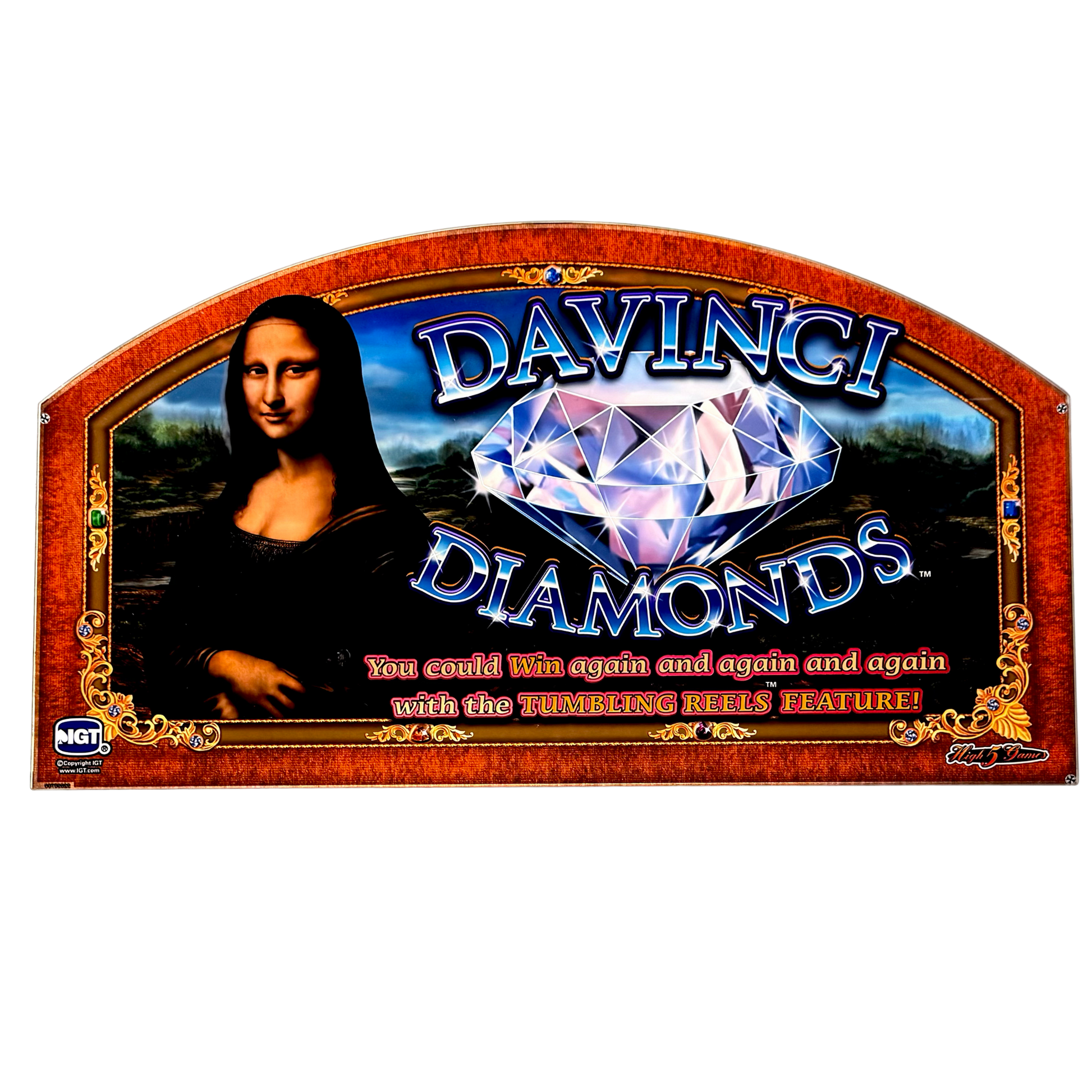 The Da Vinci Diamonds Slot Glass is a masterpiece of casino art, blending the renaissance elegance of Leonardo da Vinci’s artwork with the excitement of Tumbling Reels gameplay. The iconic Mona Lisa graces the left side, while a dazzling gemstone takes center stage, symbolizing the game's high-value wins. The ornate golden frame and deep red backdrop evoke a sense of historical grandeur. Perfect for collectors of classic slot glass and art enthusiasts who appreciate the fusion of fine art and gaming nostalgia.