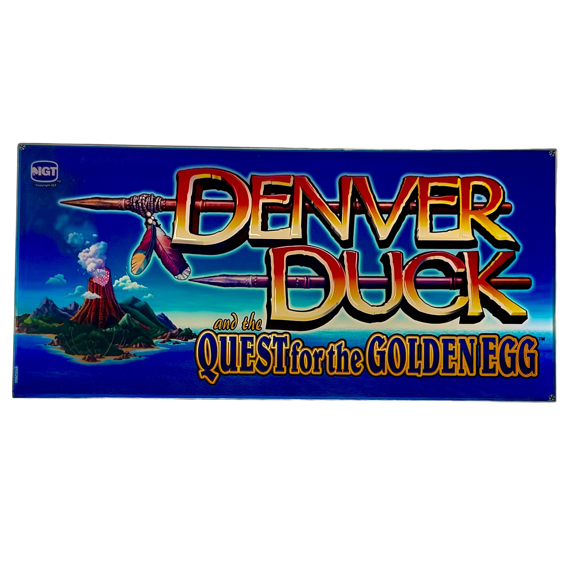 The Denver Duck Slot Glass features a bold adventure theme with striking lettering and a dynamic background, setting the stage for an exciting quest. The imagery of a volcanic island and tribal spears adds a sense of mystery, making it a standout piece for collectors and enthusiasts of vintage casino decor.