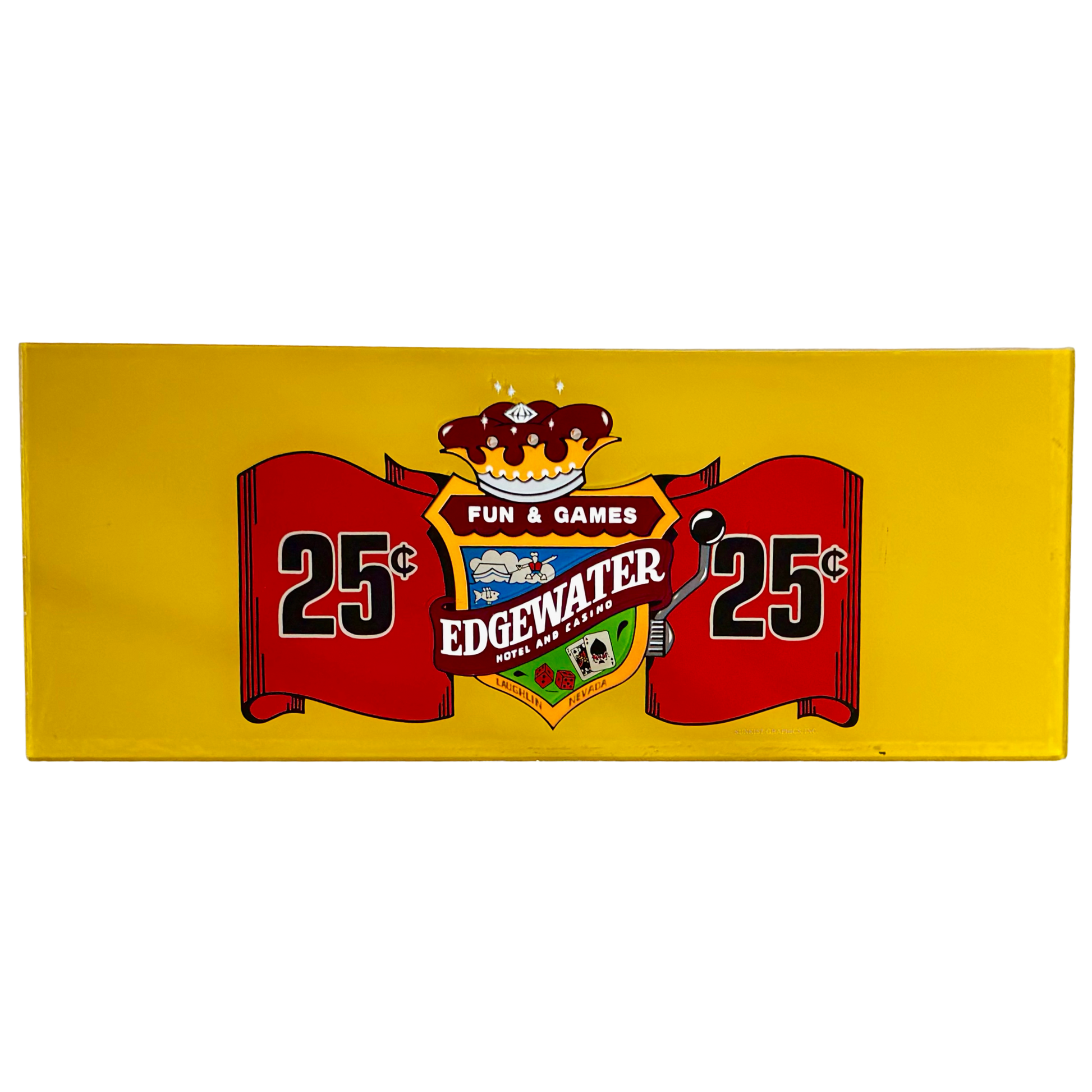 Bright, bold, and unapologetically vintage—the Edgewater Casino Slot Glass bursts with personality. With its vivid yellow background, crowned crest, and classic quarter denomination, it captures the thrill of Laughlin’s golden gaming era. This piece doesn’t just represent fun and games—it’s a time capsule of neon nights and riverfront jackpots.