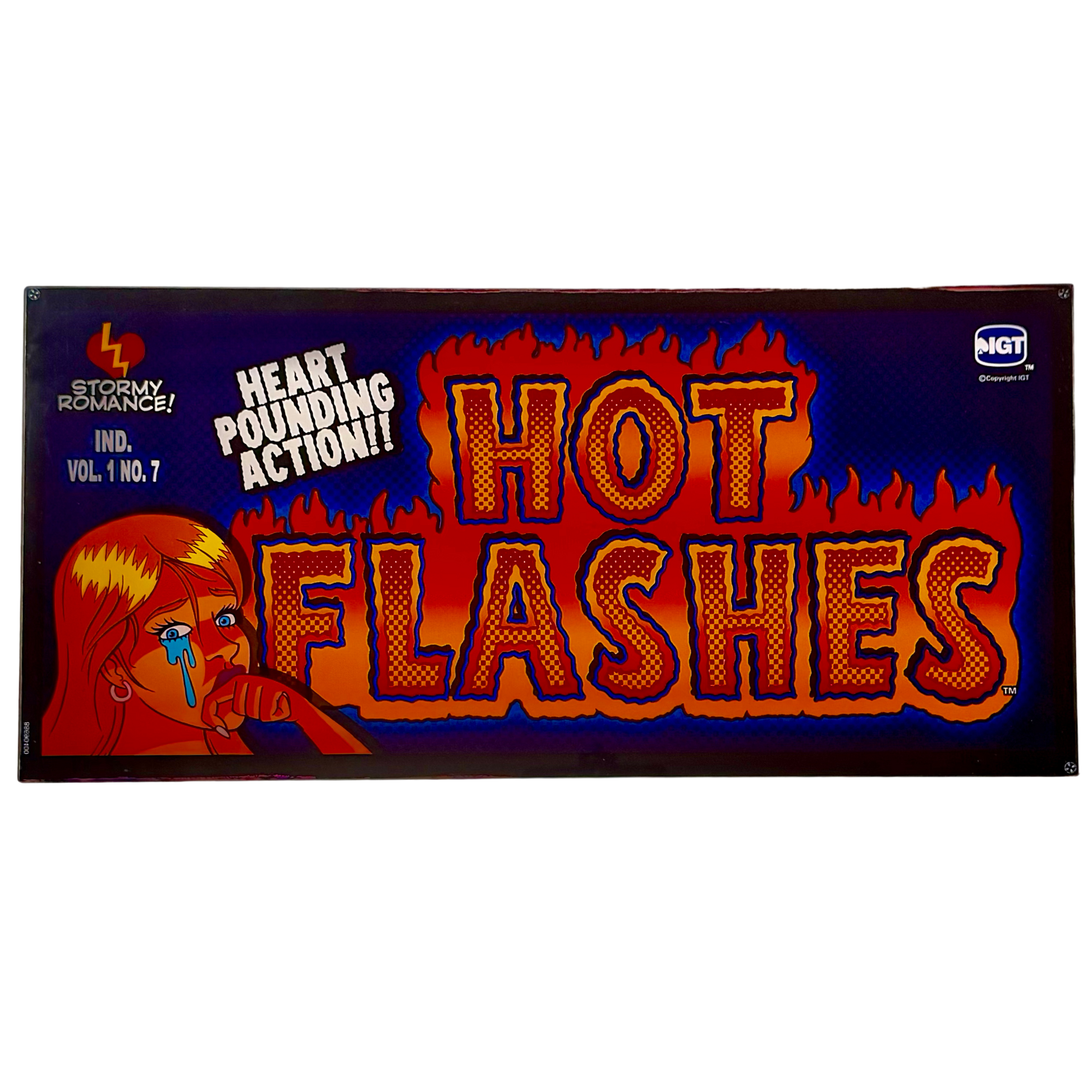 The Hot Flashes Slot Glass showcases a bold, comic-style design with fiery lettering and dramatic artwork, capturing the high-energy theme of this vintage casino piece. Perfect for collectors and enthusiasts looking for unique and nostalgic slot machine decor.