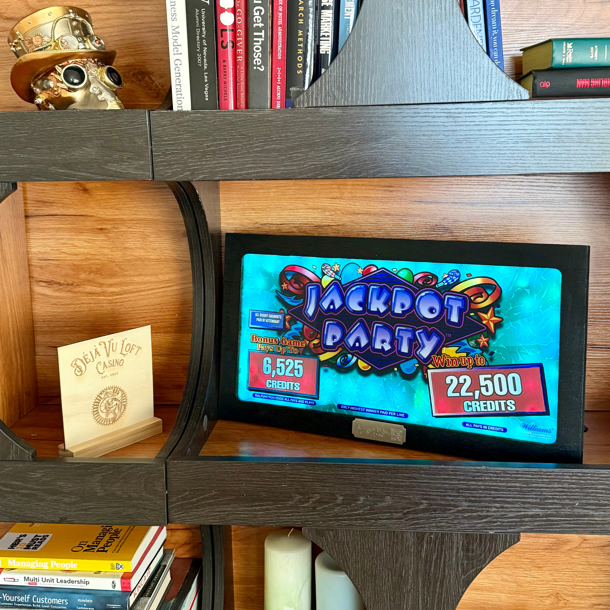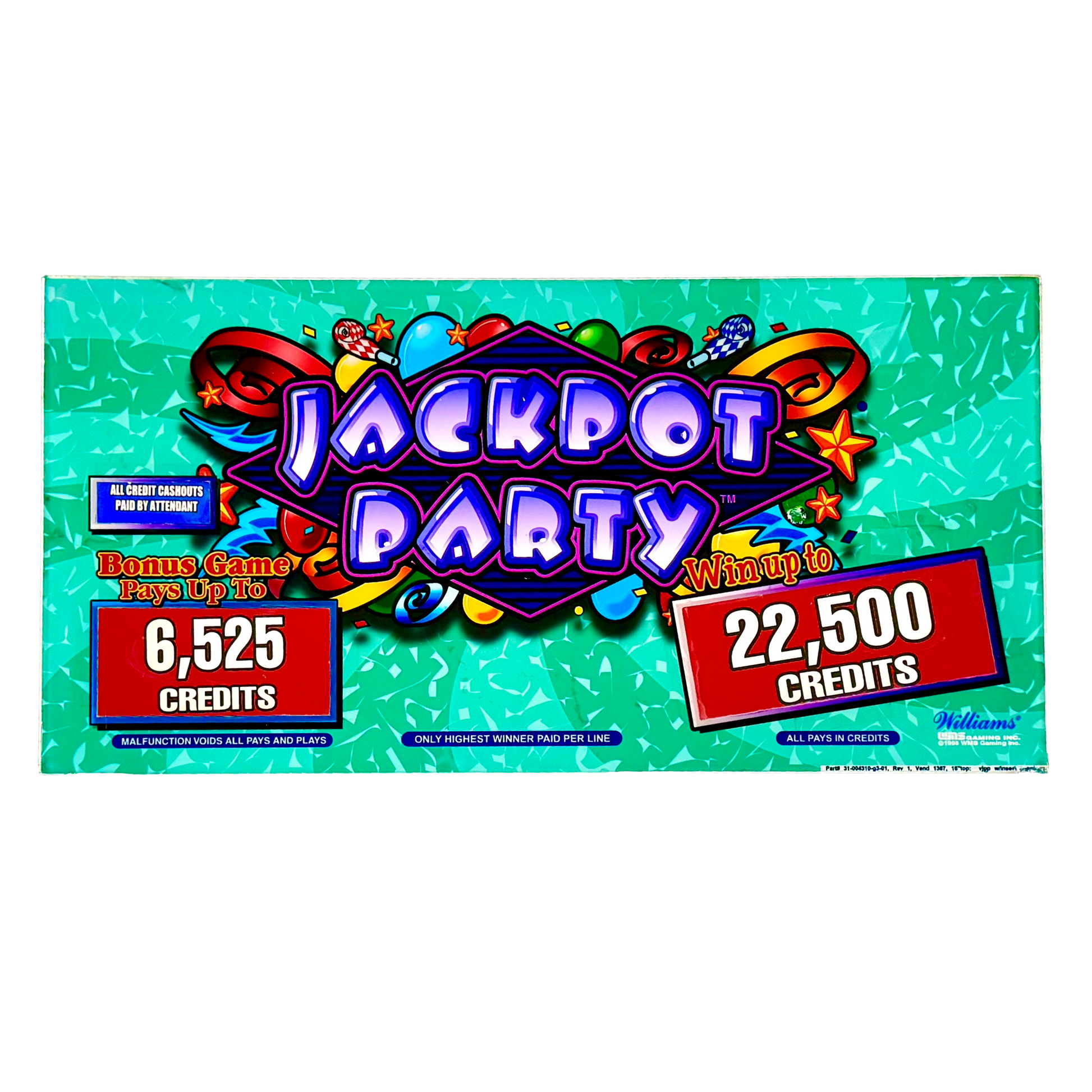Introducing the Jackpot Party Slot Glass, a vibrant and festive addition to any collection. This lively piece bursts with color, featuring balloons, stars, and celebratory elements surrounding the bold, illuminated "Jackpot Party" text. Set against a textured teal background, it captures the excitement and thrill of hitting the jackpot in a fun and playful way. Perfect for nostalgic buyers looking to relive their favorite casino moments, collectors seeking a standout piece, or decor enthusiasts wanting to add a splash of energy to their space. The Jackpot Party Slot Glass is an eye-catching celebration of casino culture and gaming excitement.