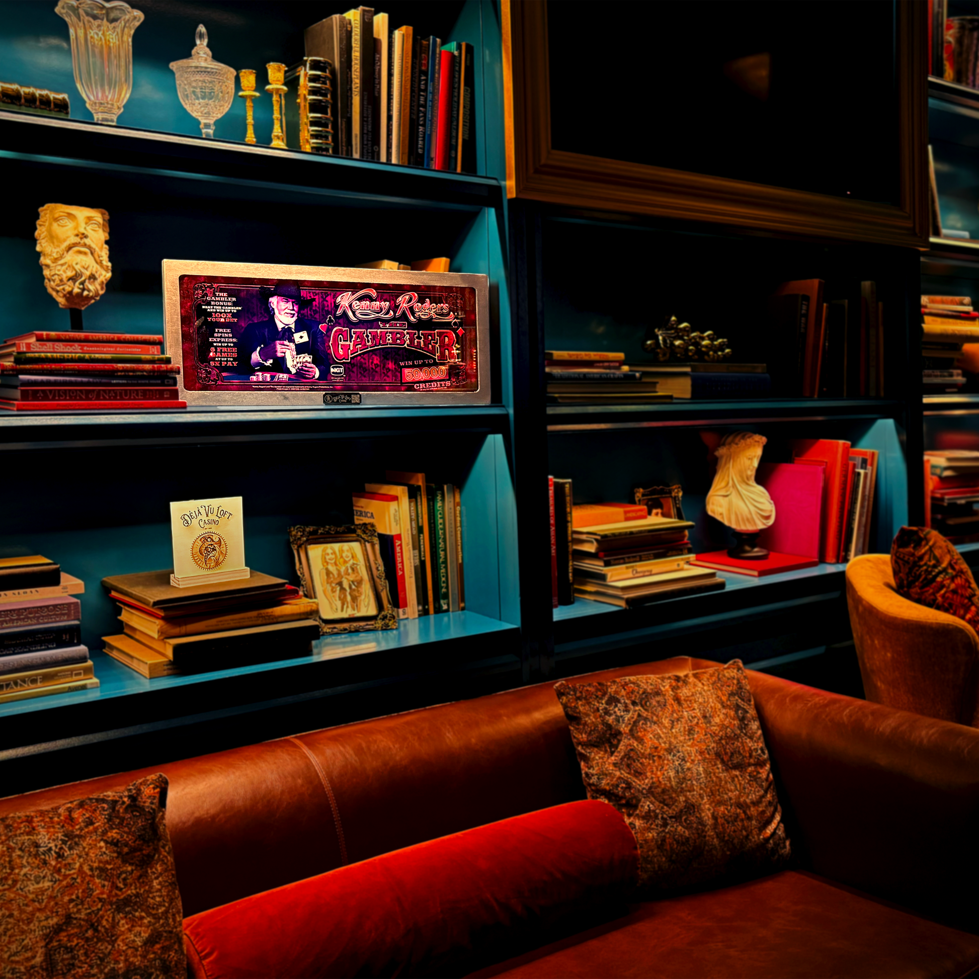 The Kenny Rogers The Gambler Slot Glass is a striking homage to the legendary country singer and his iconic song. Featuring Kenny Rogers himself in a classic Western poker setting, this design exudes a vintage gambling hall aesthetic with deep reds, rich golds, and intricate card-themed details. The elegant typography and high-stakes imagery make it a must-have for collectors, country music fans, and casino décor enthusiasts. Whether you're drawn to the nostalgia of classic gaming or the timeless appeal of "knowing when to hold 'em," this piece brings a legendary gambler's spirit to any space.