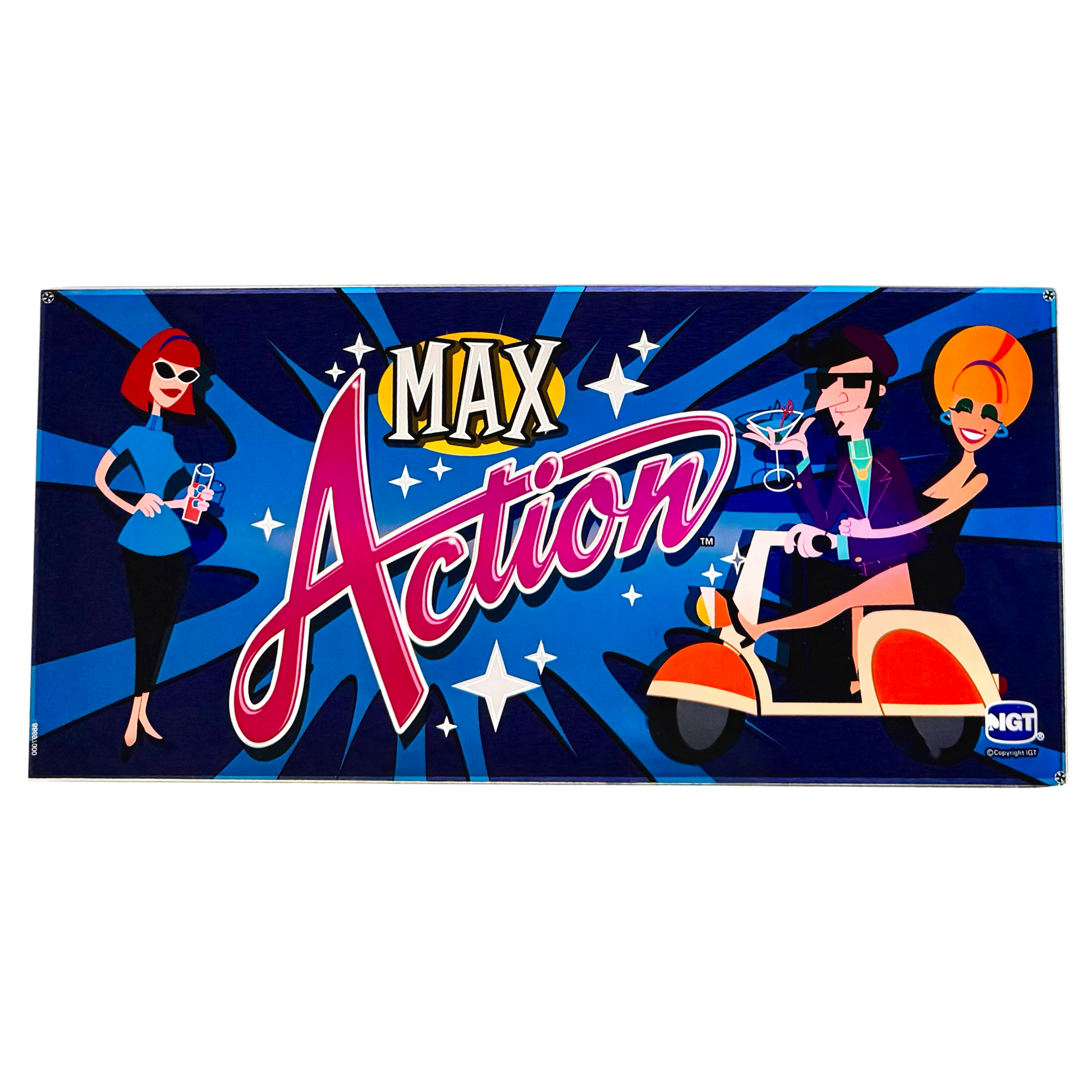 Turn up the excitement with the Max Action Vintage Slot Machine Glass! This dynamic design bursts with retro flair, featuring vibrant cartoon characters—cool riders on a scooter, stylishly sipping cocktails—set against a bold, star-studded blue backdrop. The energetic typography and lively color scheme perfectly capture the thrill of fast-paced fun and adventure. Ideal for game rooms, home bars, or vintage decor collections, this nostalgic piece brings the spirit of action-packed nights and carefree joy to any space!
