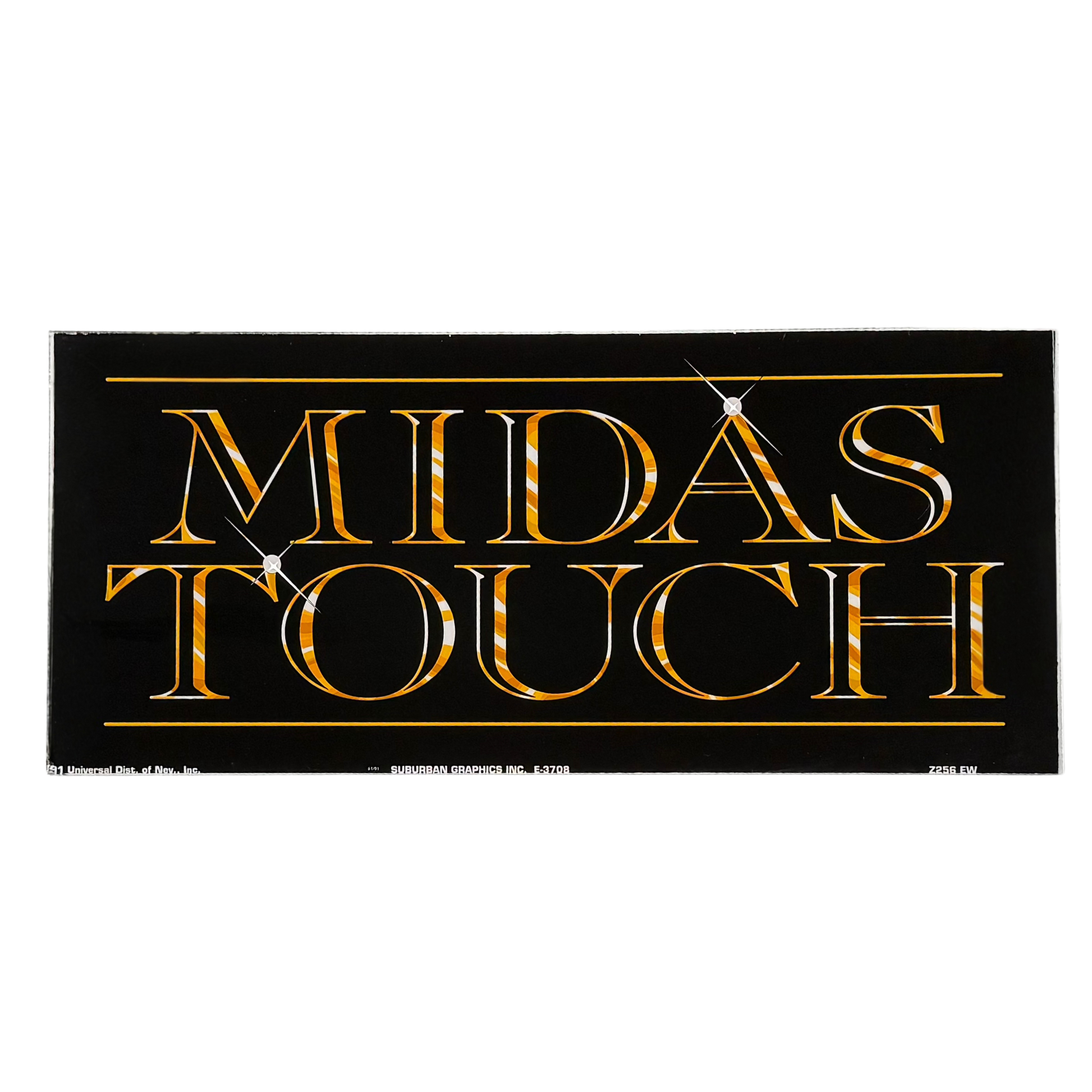 Introducing the Midas Touch Slot Glass, a sleek and sophisticated piece of vintage casino décor featuring bold gold lettering against a black background. This authentic slot glass, originally designed for Universal Distributing slot machines, captures the elegance and allure of classic gaming.