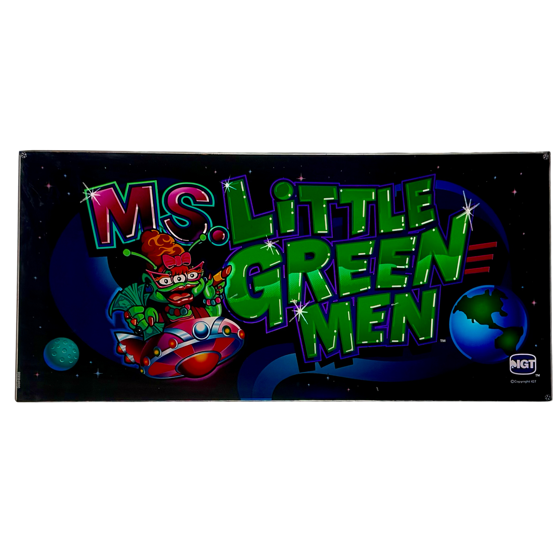 The Ms. Little Green Men Slot Glass features a playful extraterrestrial theme with a quirky alien character flying a UFO, set against a deep space backdrop. The bold green lettering and cosmic elements make this a fun and nostalgic addition to any collection, perfect for enthusiasts of classic slot glass with a sci-fi twist.
