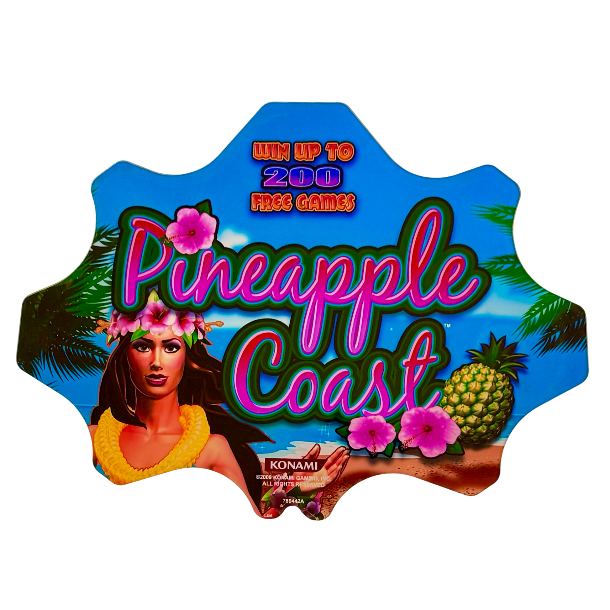 A tropical blast from the past. With vivid island blues, blooming hibiscus, and the promise of up to 200 free games, this piece brings all the aloha vibes. Whether you remember spinning the reels beachside or just love that vintage island glam, Pineapple Coast is pure paradise on acrylic.