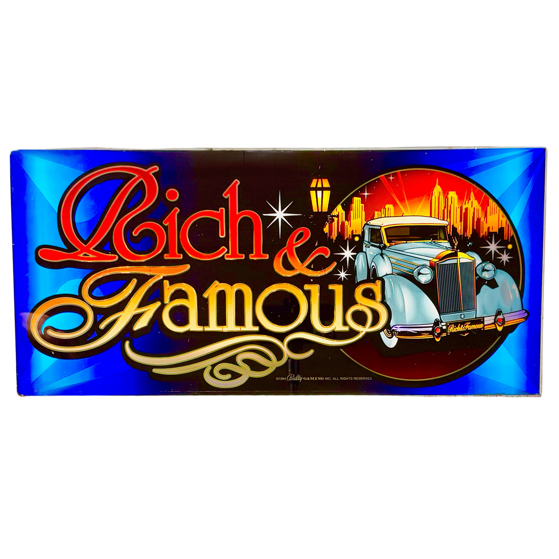 The Rich & Famous Slot Glass exudes luxury and sophistication, featuring an elegant vintage car set against a glowing city skyline. The bold red and gold lettering, paired with dazzling light effects, captures the essence of high-class glamour. Perfect for collectors, casino enthusiasts, or as a statement decor piece, this slot glass celebrates the thrill of wealth and prestige.