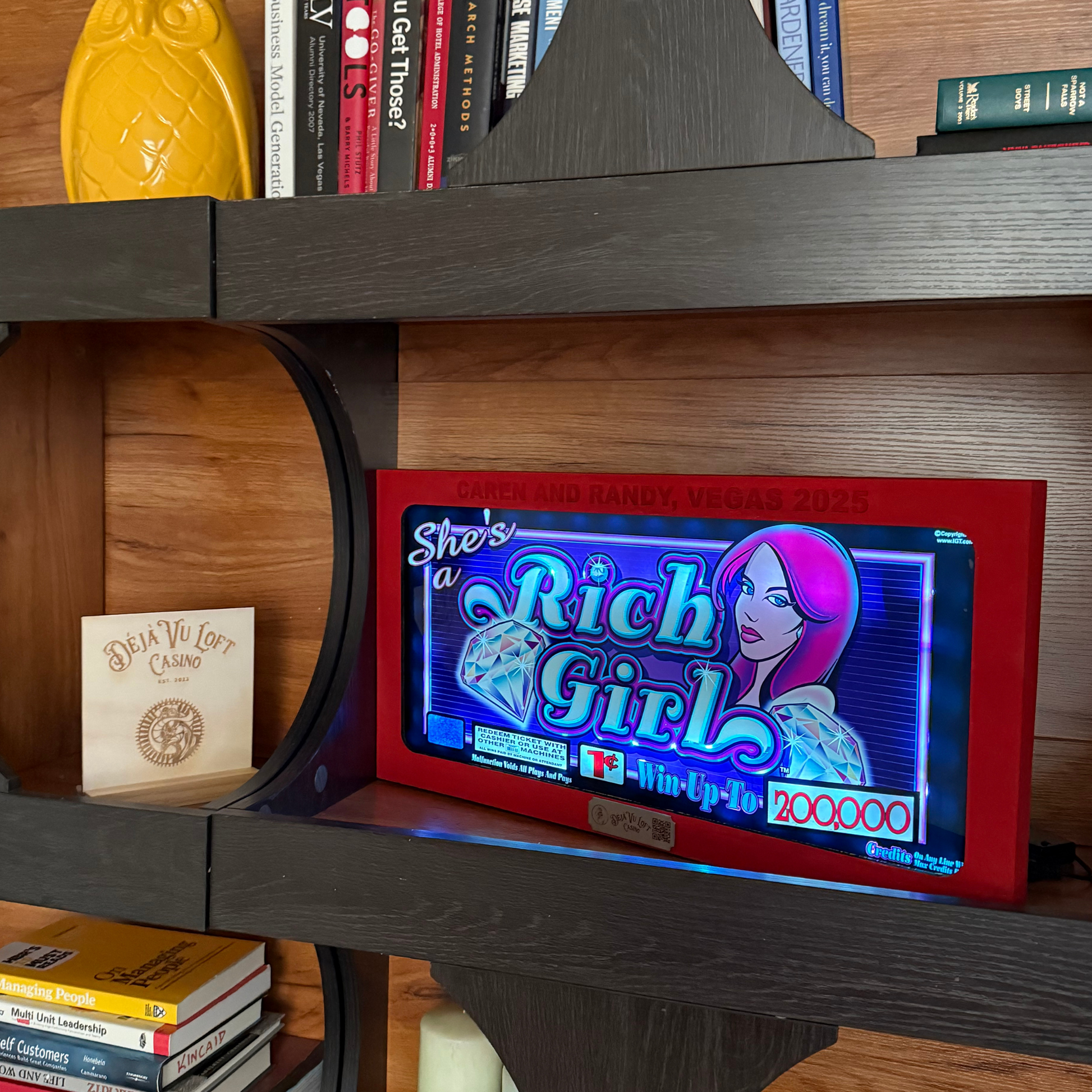 Add a touch of glamour to your space with the She’s a Rich Girl Vintage Slot Machine Glass! This dazzling design features a striking red-haired beauty set against bold neon lettering and sparkling diamonds, capturing the luxurious and confident vibe of high-stakes excitement. The vibrant colors and stylish artwork make this piece perfect for elevating your game room, home bar, or vintage decor collection. Let this nostalgic glass art remind you to play big, live bold, and shine bright!