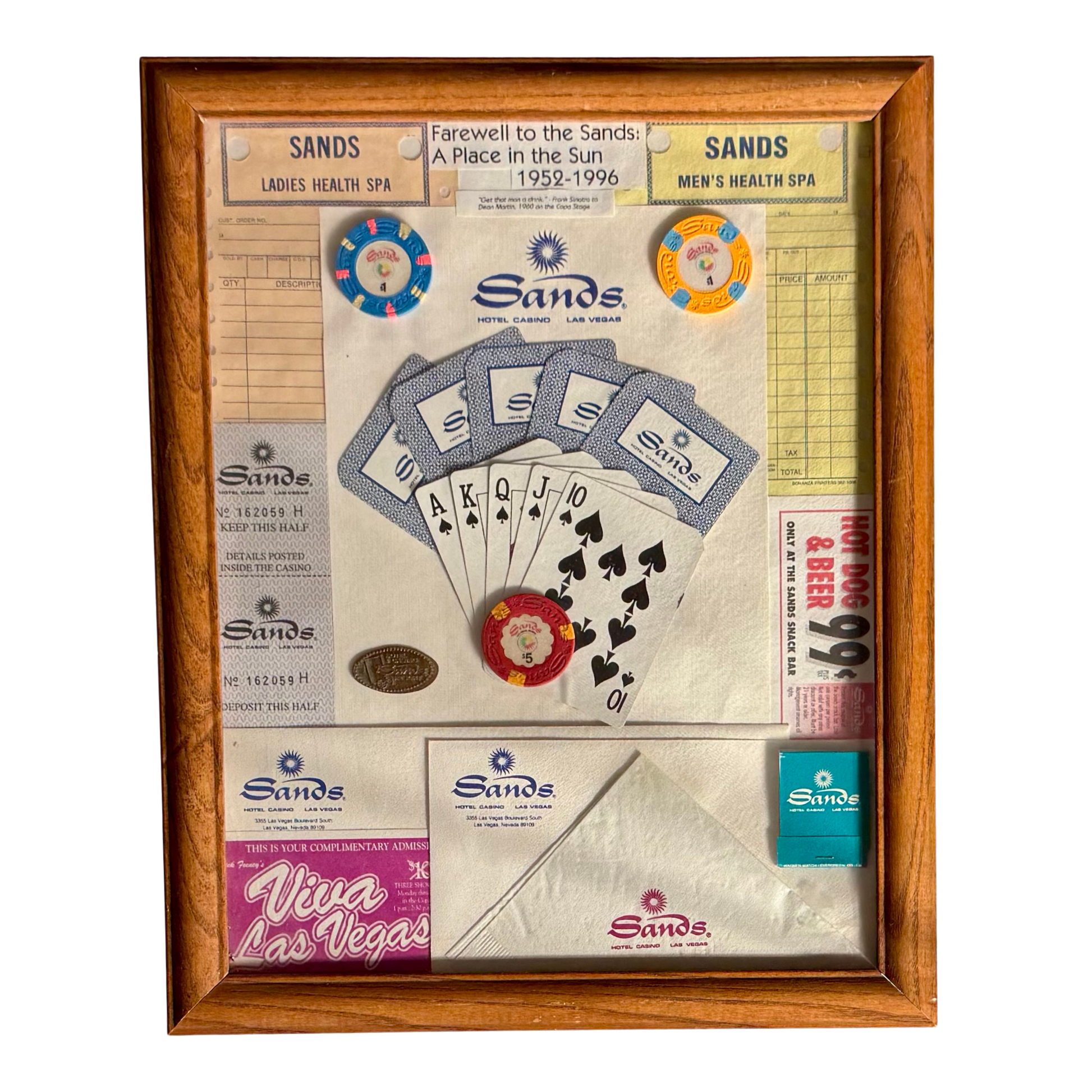 A true farewell to one of Las Vegas’ most iconic casinos, this Sands Casino Slot Glass display captures the spirit of the legendary property that stood from 1952–1996. Framed in a vintage wooden case, it showcases an unforgettable mix of Sands memorabilia — spa passes, drink tickets, casino chips, matchbooks, napkins, and even a hand of cards featuring a royal flush.