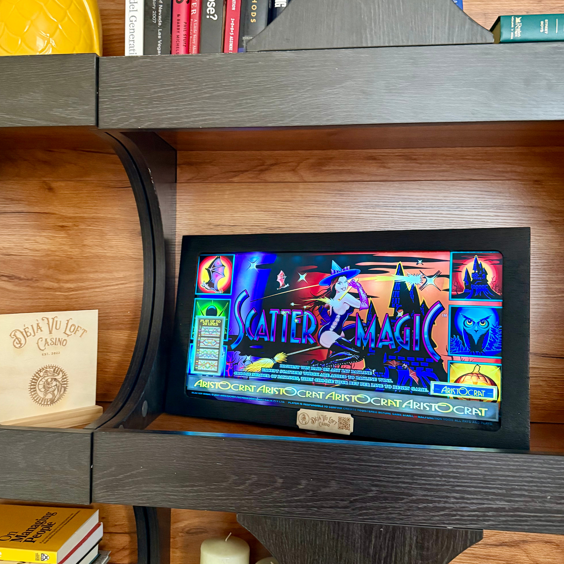 The Scatter Magic Slot Retro Acrylic is a spellbinding blend of mystery and mischief. Featuring a sultry witch, gothic castle, and enchanting neon tones, this piece delivers vintage Vegas vibes with a supernatural twist. A captivating addition to any collection, perfect for fans of fantasy, Halloween, or high-stakes charm.