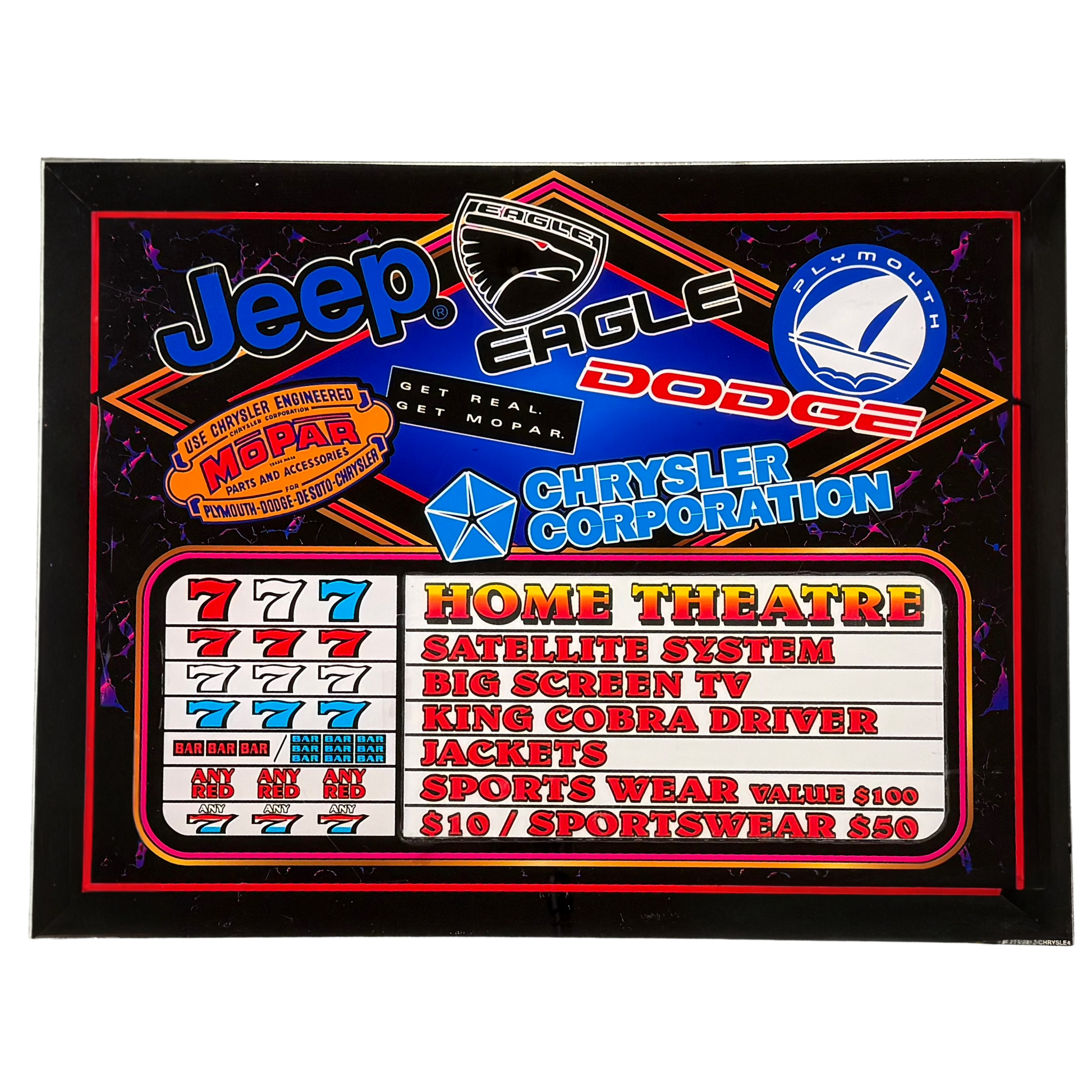 Celebrate classic American automotive brands with the Jeep Eagle Dodge Chrysler Slot Retro Acrylic! Featuring vintage logos from Jeep, Eagle, Dodge, and Chrysler Corporation, along with Mopar branding, this unique slot glass is a must-have for car enthusiasts and collectors. The payout table showcases a variety of exciting prizes, making it a nostalgic tribute to both casino history and the golden era of American muscle and performance vehicles.