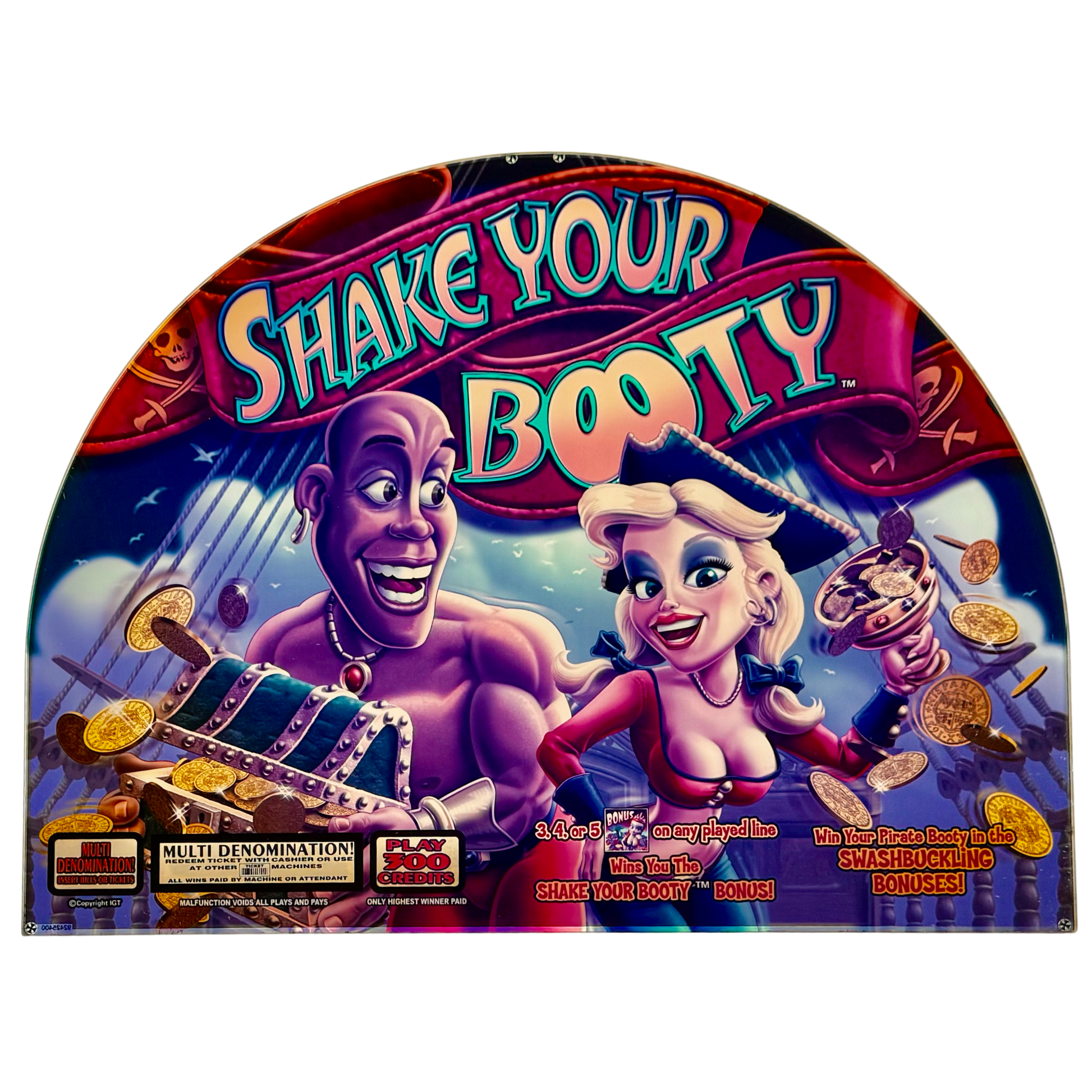 The Shake Your Booty Slot Glass is a lively and adventurous piece featuring a fun, swashbuckling pirate theme. With bold, colorful characters—an energetic pirate and a charming first mate—set against a thrilling ocean backdrop, this design captures the excitement of treasure hunting. The playful typography and animated gold coins add to the high-energy aesthetic, making it a perfect addition for collectors, casino décor enthusiasts, or anyone looking to bring a touch of pirate fun and fortune to their space.