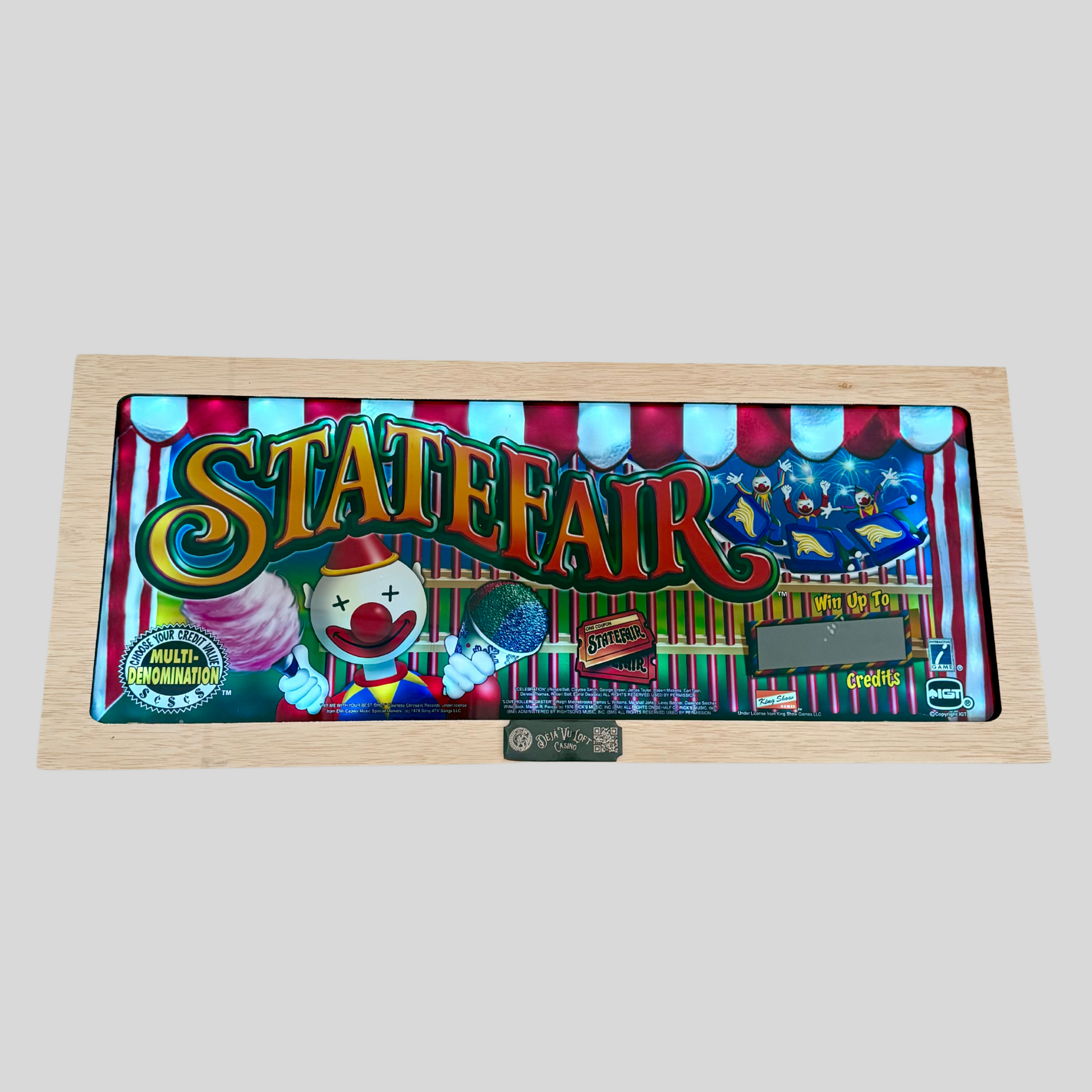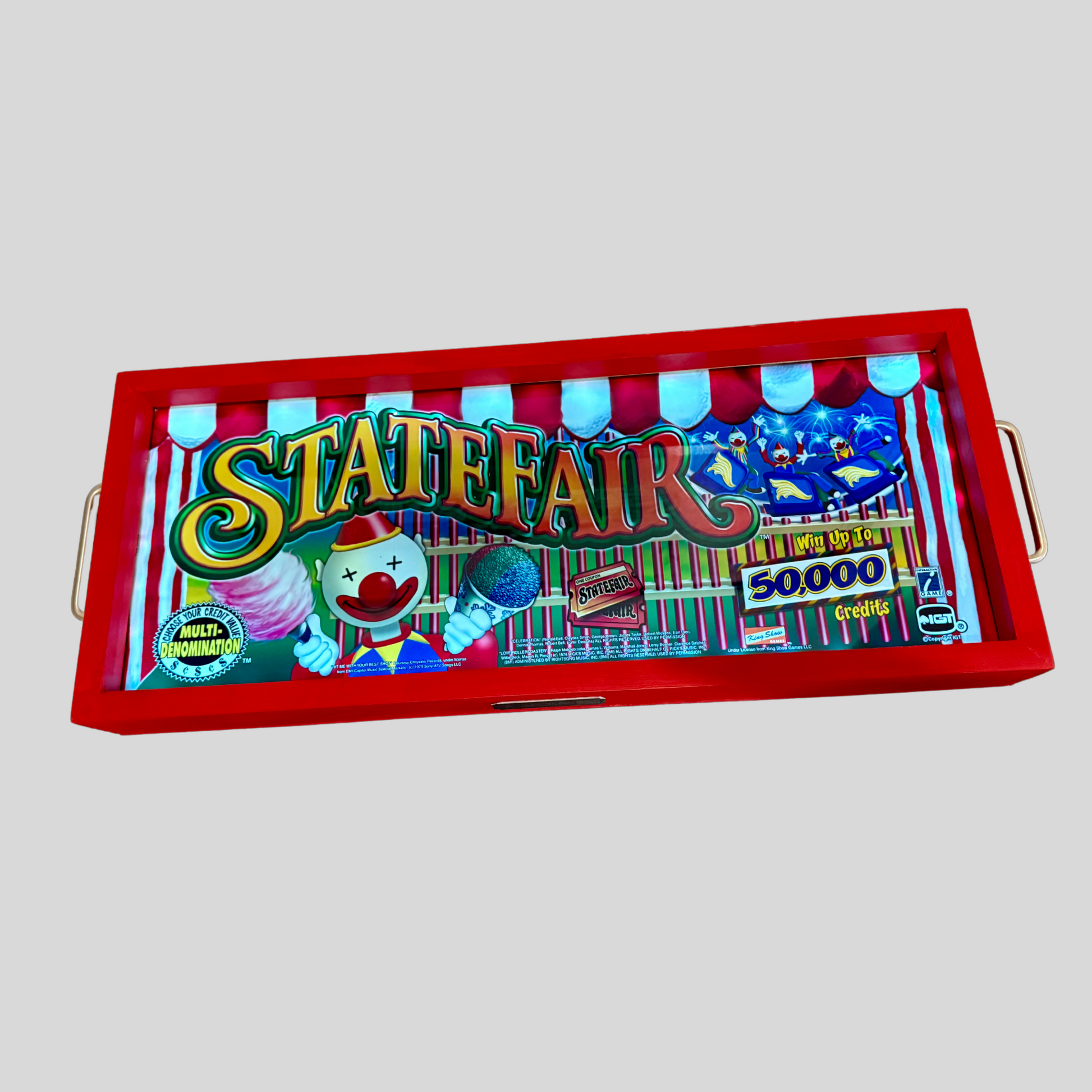 Step right up and relive the excitement with the State Fair Vintage Slot Machine Glass! Bursting with festive colors and carnival charm, this piece features a cheerful clown holding classic fair treats—cotton candy and a glittering candy apple—set against a backdrop of fireworks and vibrant striped tents. The playful design captures the magic of state fairs, making it a lively addition to any game room, home bar, or nostalgic collection. Bring home the thrill of the midway and let the State Fair light up your space with fun and memories!