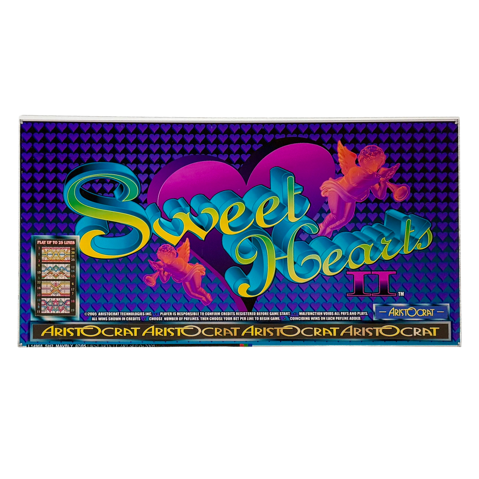 Introducing the Sweet Hearts II Slot Retro Acrylic, a romantic and visually enchanting piece featuring vibrant colors and playful cherubs set against a background of deep purple hearts. The elegant script and warm tones make this slot glass a perfect addition for collectors who cherish classic casino aesthetics with a touch of romance. Whether you're seeking a nostalgic reminder of special moments or a charming decorative piece for your home, the Sweet Hearts II Slot Retro Acrylic offers a timeless allure that captures the magic of love and luck.