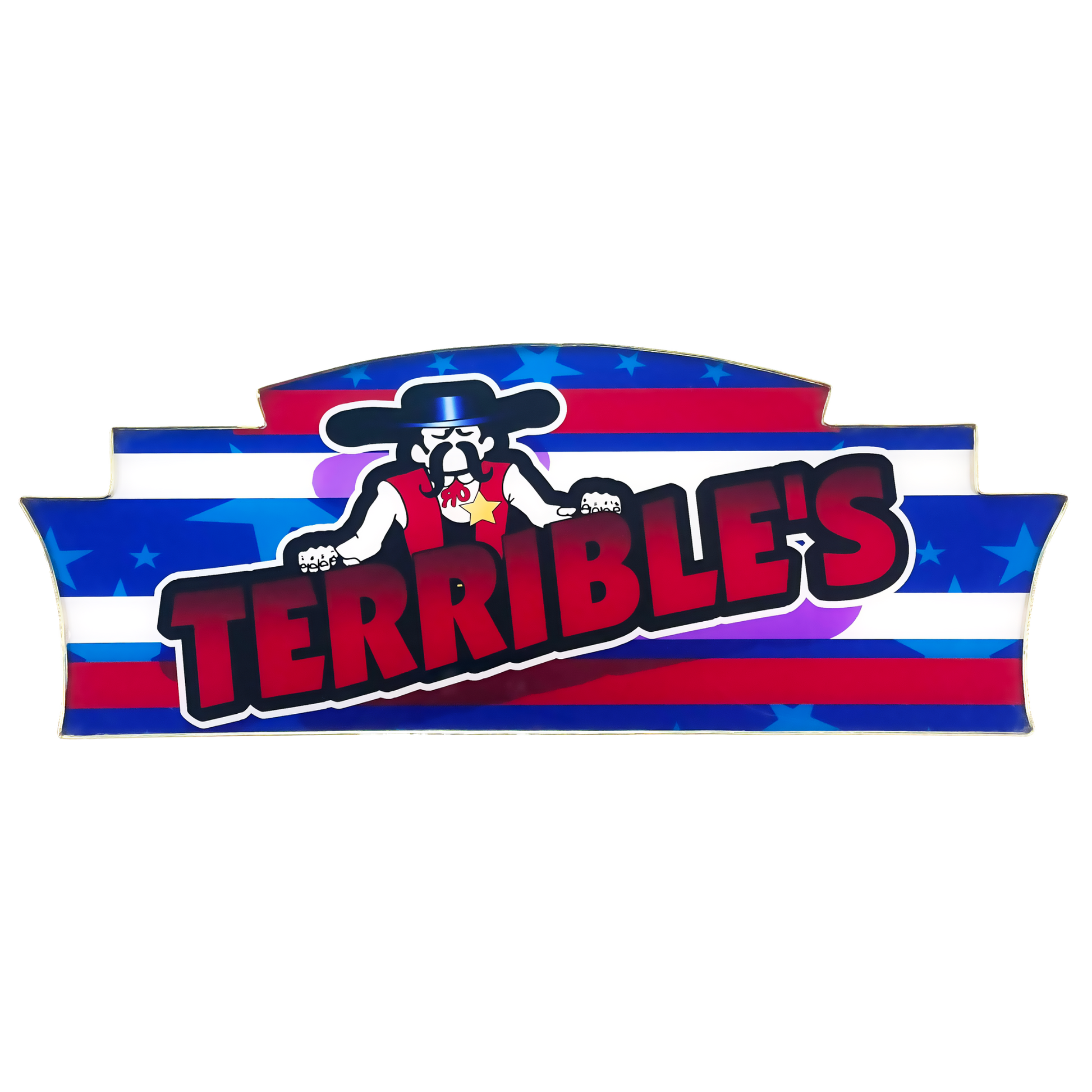 The Terrible’s Slot Retro Acrylic showcases a bold and patriotic design with red, white, and blue stripes and scattered stars, capturing the essence of classic Americana. The artwork features a rugged cowboy character, complete with a mustache, hat, and vest, reinforcing a vintage Western casino aesthetic. The Terrible’s logo is prominently displayed in bold red letters, outlined in black, ensuring a striking visual appeal. Perfect for collectors, nostalgia enthusiasts, or anyone wanting to add a touch of casino history to their décor.